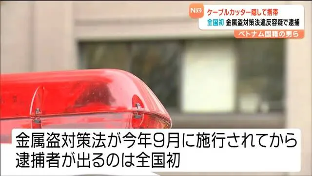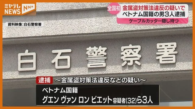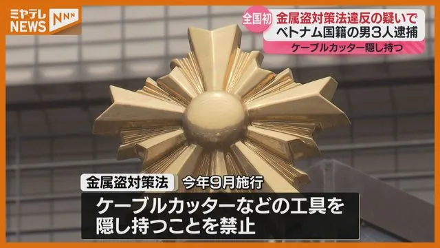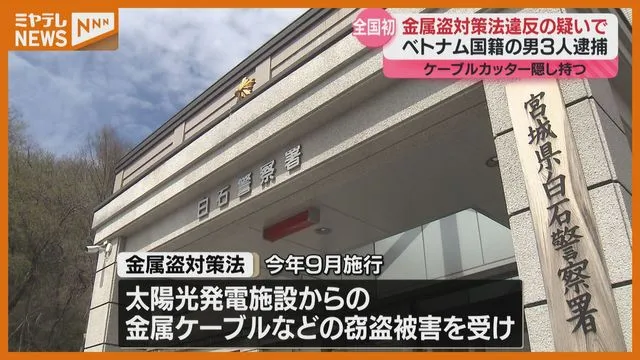 Cảnh sát tỉnh Miyagi, Nhật Bản, đã bắt giữ ba công dân quốc tịch Việt Nam với cáo buộc vi phạm "Luật Phòng chống Trộm cắp Kim loại" – đây là những vụ bắt giữ đầu tiên trên toàn quốc kể từ khi luật này có hiệu lực. Ba người đàn ông bị nghi ngờ tàng trữ kìm cắt cáp chuyên dụng mà không có lý do chính đáng.