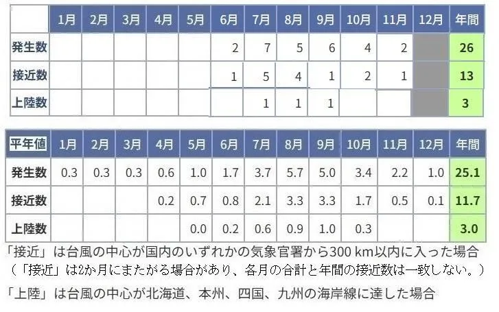 Năm nay, bão số 5 đã đổ bộ vào Hokkaido vào tháng 7, bão số 12 vào tỉnh Kagoshima vào tháng 8, và bão số 15 vào tỉnh Kochi vào tháng 9. Dường như sẽ không có thêm cơn bão nào đổ bộ trong thời gian tới, vì vậy tổng số bão đổ bộ có thể sẽ là 3 cơn, tương đương mức trung bình hàng năm.