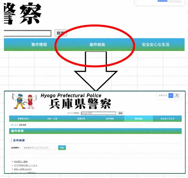Trang web giả mạo của Cảnh sát tỉnh Hyogo. Menu "Tư vấn các loại" đã được thay đổi thành "Tìm kiếm vụ việc" = Do Cảnh sát tỉnh cung cấp.