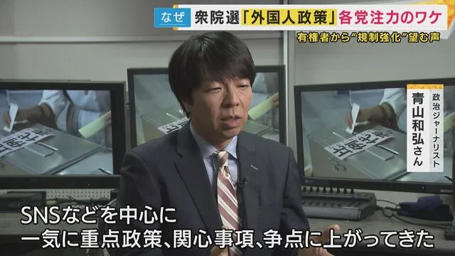 Trong cuộc tổng tuyển cử Hạ viện lần này, chính sách đối với người nước ngoài đã trở thành một điểm nóng quan trọng. Khi lắng nghe ý kiến cử tri trên đường phố, nhiều người bày tỏ mong muốn siết chặt quy định. [Người ở độ tuổi 20]: "(Việc tiếp nhận người nước ngoài) nên tạm dừng, và nên có thêm các chính sách tập trung vào người Nhật. Tôi nghĩ việc hoàn toàn không có là khó, nhưng tôi mong muốn họ nâng cao tiêu chuẩn hoặc làm điều gì đó." [Người ở độ tuổi 70]: "Thanh niên lao động ít đi. Vì vậy tôi nghĩ (người nước ngoài) là cần thiết. Nhưng không thể chỉ đơn giản là tiếp nhận mà không kiểm tra gì." [Người ở độ tuổi 20]: "Đối với việc tiếp nhận người nhập cư, tôi nghĩ cần phải siết chặt quy định." Điều gì đứng sau những tiếng nói này? Nhà báo chính trị Aoyama Kazuhiro giải thích về quá trình chủ đề này trở thành điểm nóng: [Ông Aoyama Kazuhiro]: "Đảng Tham Chính đã đưa ra chính sách 'Người Nhật là trên hết' và bắt đầu thu hút sự quan tâm lớn, chủ yếu trên mạng xã hội, ngay từ thời gian vận động tranh cử. Các chính sách trọng tâm, các vấn đề được quan tâm đã nổi lên thành điểm nóng, chủ yếu trên mạng xã hội." Trong cuộc tổng tuyển cử Thượng viện năm ngoái, Đảng Tham Chính đã quảng bá chính sách đối với người nước ngoài, trở thành điểm đến của phiếu bầu bảo thủ và đạt được bước tiến lớn. Sau đó, chính quyền Takaichi được thành lập cũng bày tỏ quan điểm siết chặt quy định, và vấn đề này nhanh chóng nổi lên như một điểm nóng quan trọng. Ông Aoyama chỉ ra rằng: "Nhật Bản đã cho rằng không cần chính sách hay luật pháp cho người nhập cư vì không chấp nhận nhập cư, nhưng trên thực tế, có những người đến làm việc, có những người đến bằng visa, và việc siết chặt các quy định đã không theo kịp, theo một nghĩa nào đó, chính trị đã có phần chậm trễ."