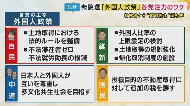Ngày 27, trong cuộc tổng tuyển cử Hạ viện vừa được công bố, "chính sách đối với người nước ngoài" đã nổi lên như một điểm nóng bên cạnh chính sách thuế tiêu thụ. Xem video: Vì sao các đảng chú trọng "chính sách đối với người nước ngoài" Tại sao một chủ đề ít được tranh luận công khai trước đây lại trở thành chính sách được các đảng chú trọng trong cuộc bầu cử lần này? Chúng tôi đã phỏng vấn những ý kiến ủng hộ và phản đối việc tiếp nhận lao động nước ngoài.