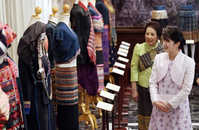 Tại "Lao Silk Residence", Công chúa Aiko, trưởng nữ của Thiên hoàng và Hoàng hậu, xem trang phục truyền thống các dân tộc. Ảnh chụp sáng ngày 21 tại Vientiane, Lào (ảnh của đại diện).