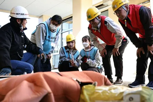 Thảo (thứ tư từ trái sang), một du học sinh người Việt, cùng những người khác theo dõi buổi huấn luyện cứu hộ sử dụng kích nâng tại quận Nishi, thành phố Kobe, ngày 22 tháng 11 năm 2025, ảnh: Yoshinori Mizuno.