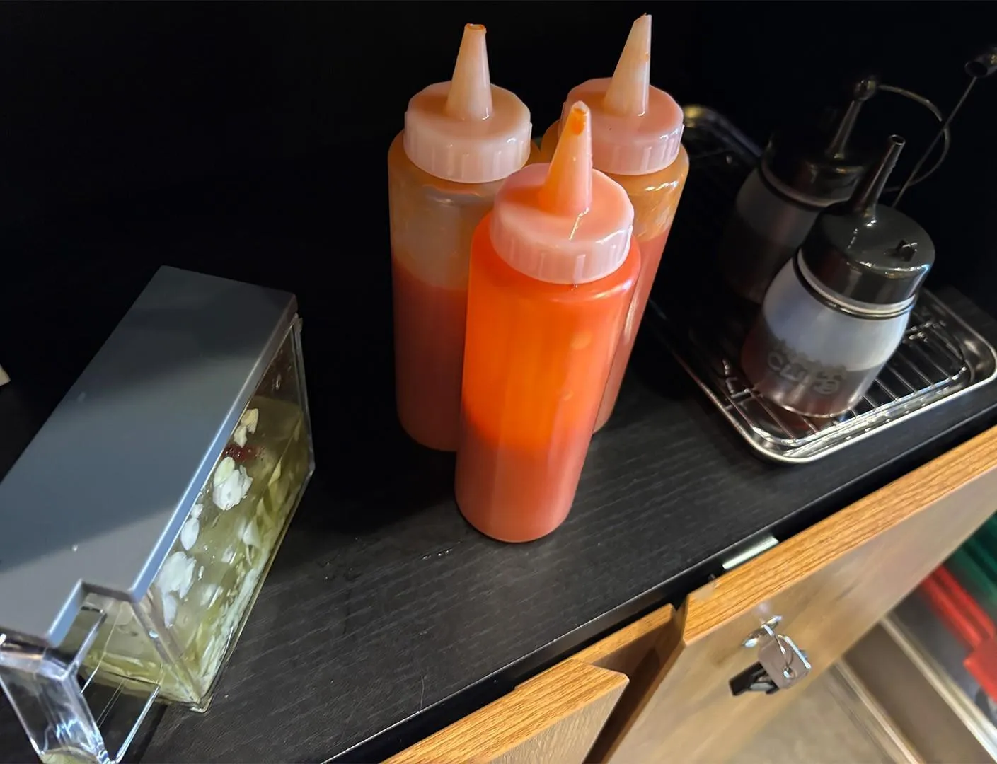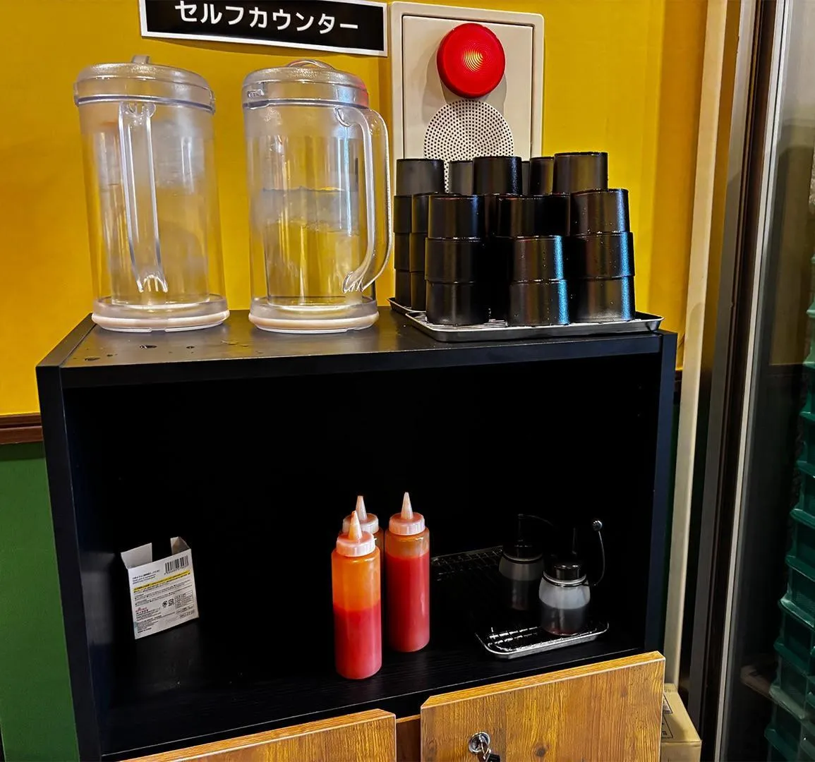 Nước chanh và gia vị ở bên phải lối vào được sử dụng tại quầy tự phục vụ.