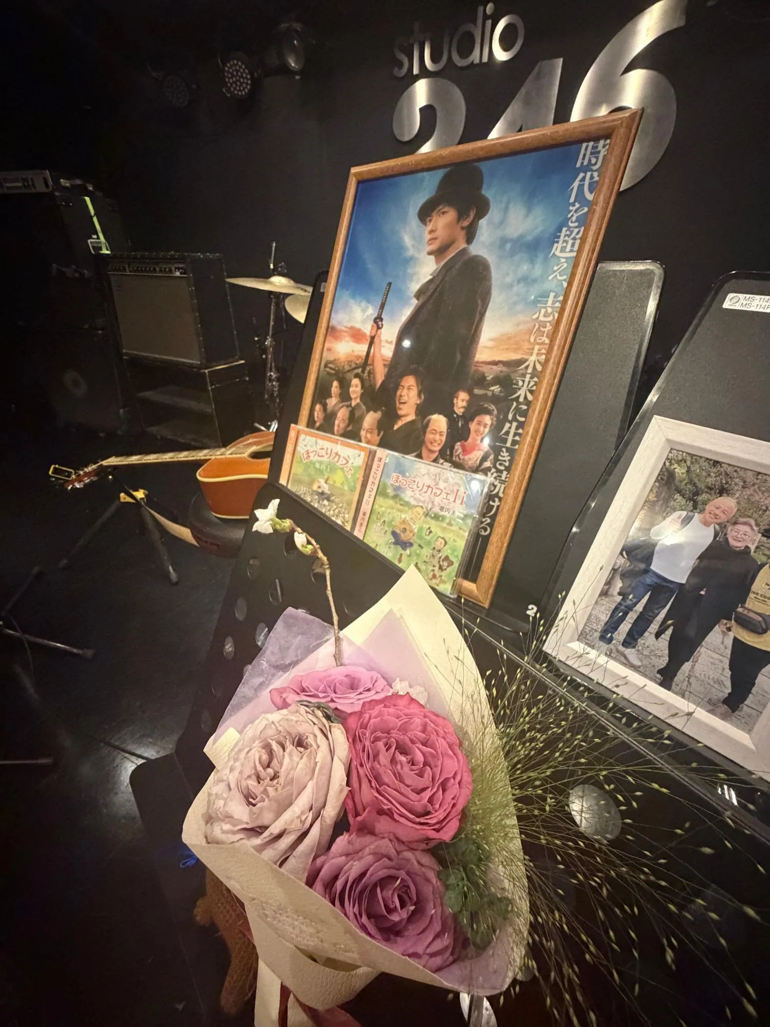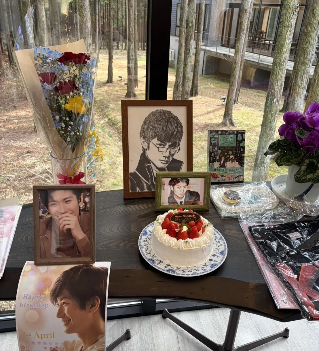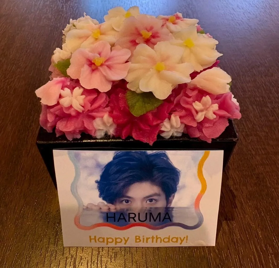 Trong ảnh, tôi đến studio và trang trí hoa. Nếu nhìn kỹ, đó là hoa hồng và hoa anh đào, nhưng ở phía dưới có một con thú nhồi bông hình con ngựa, tượng trưng cho Haruma. Tôi nghĩ rằng việc nhận được những điều tuyệt vời như vậy giống như đã được định sẵn. Xin cảm ơn."