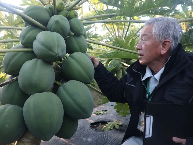Đu đủ xanh Biwako trĩu quả. Loại cây này đang được trồng làm đặc sản mới của Shiga (Thị trấn Shimogasa, Thành phố Kusatsu).