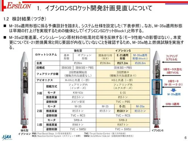 Cụ thể, tầng thứ hai của Epsilon S sẽ được thay đổi từ loại E-21 mới sang loại "M-35a" dựa trên M-35 của Epsilon tăng cường, và hướng tới mục tiêu phóng thử nghiệm trong năm tài chính 2026. Tên của phiên bản sử dụng M-35a sẽ là "Tên lửa Epsilon S Block1".