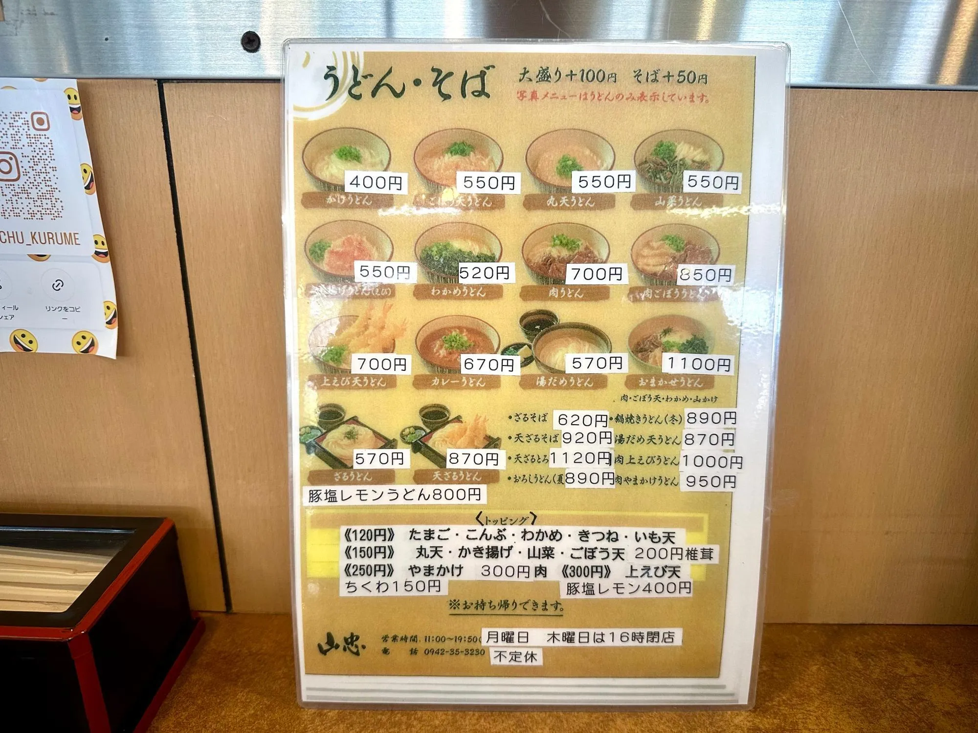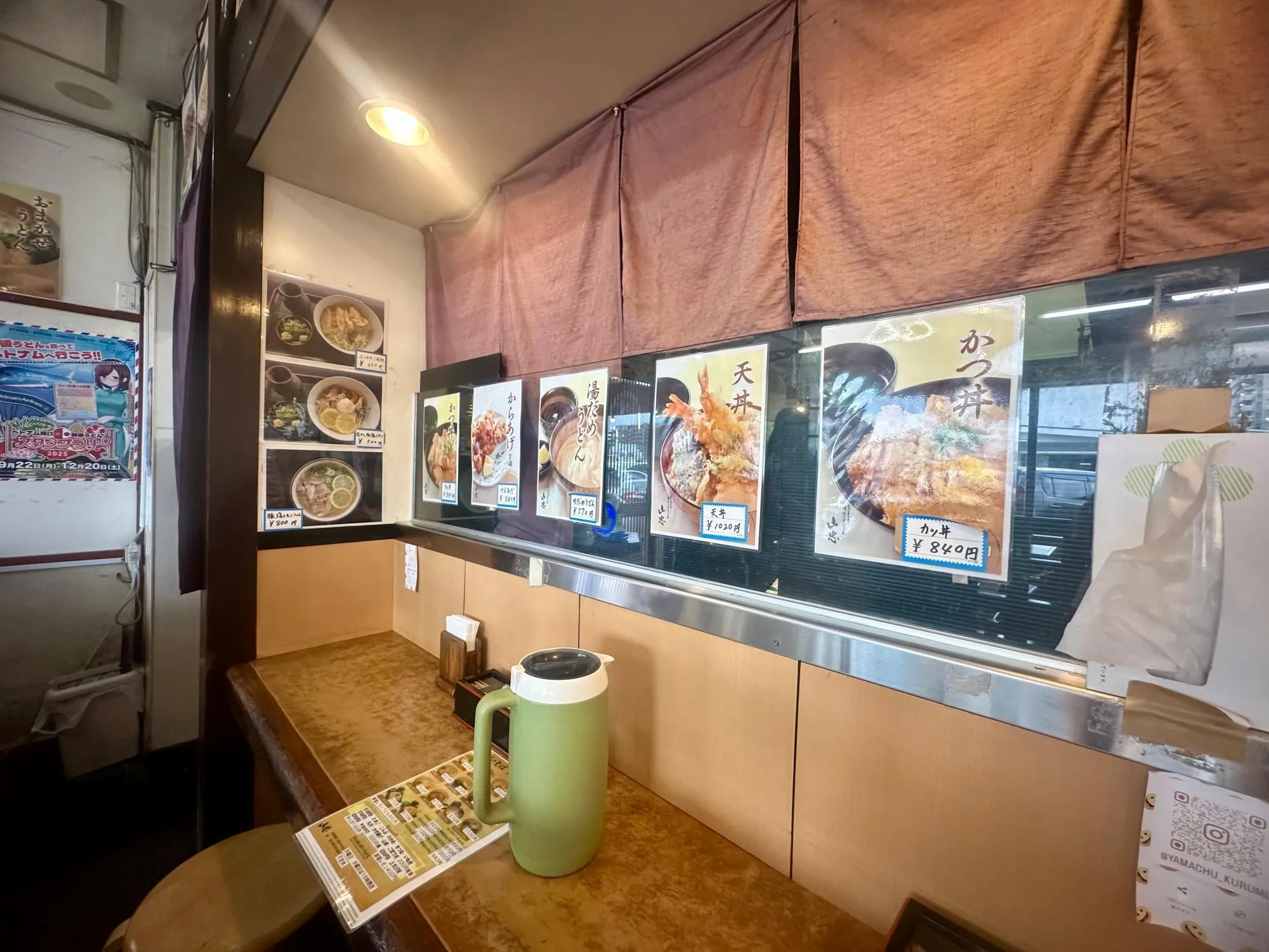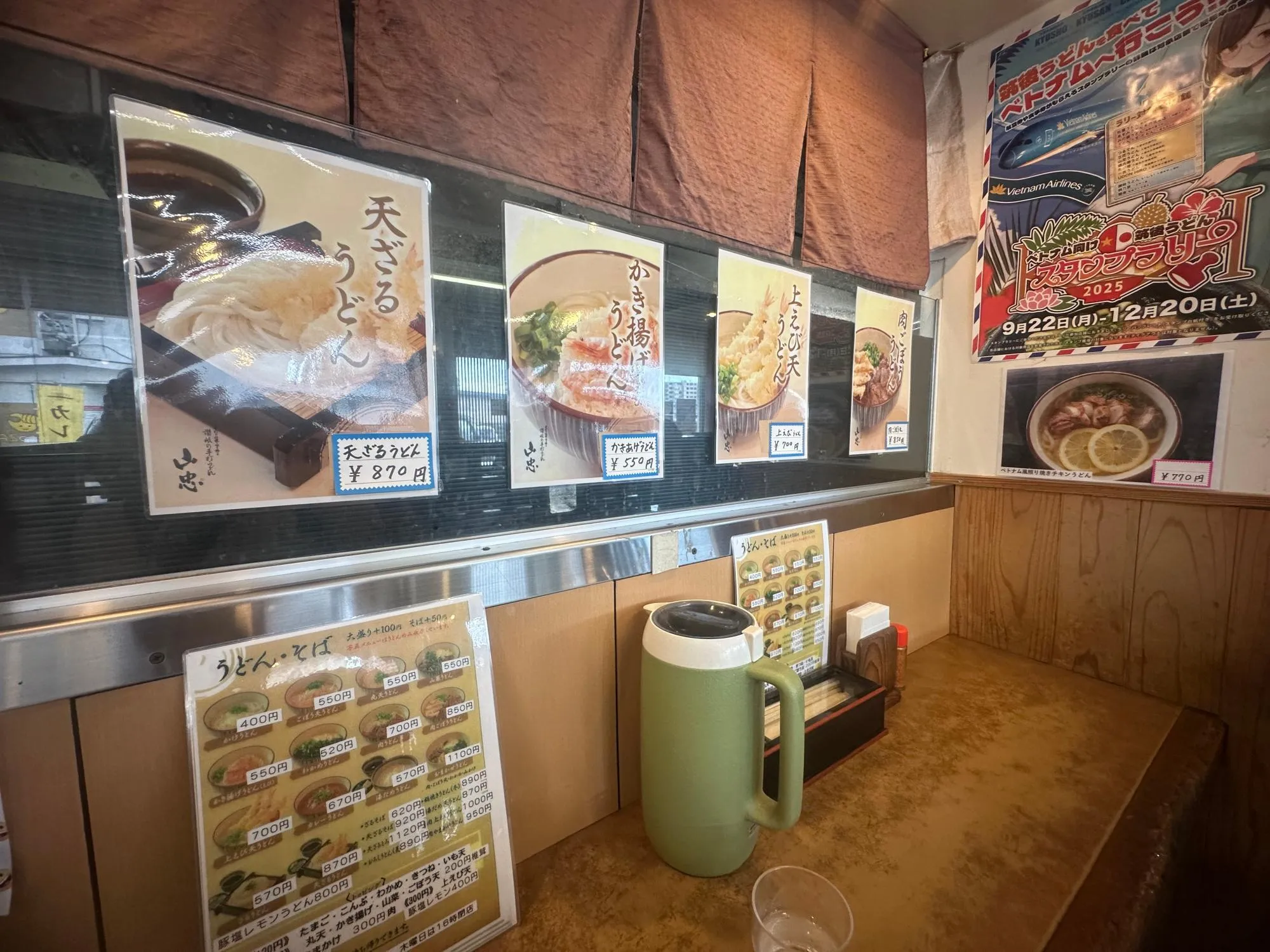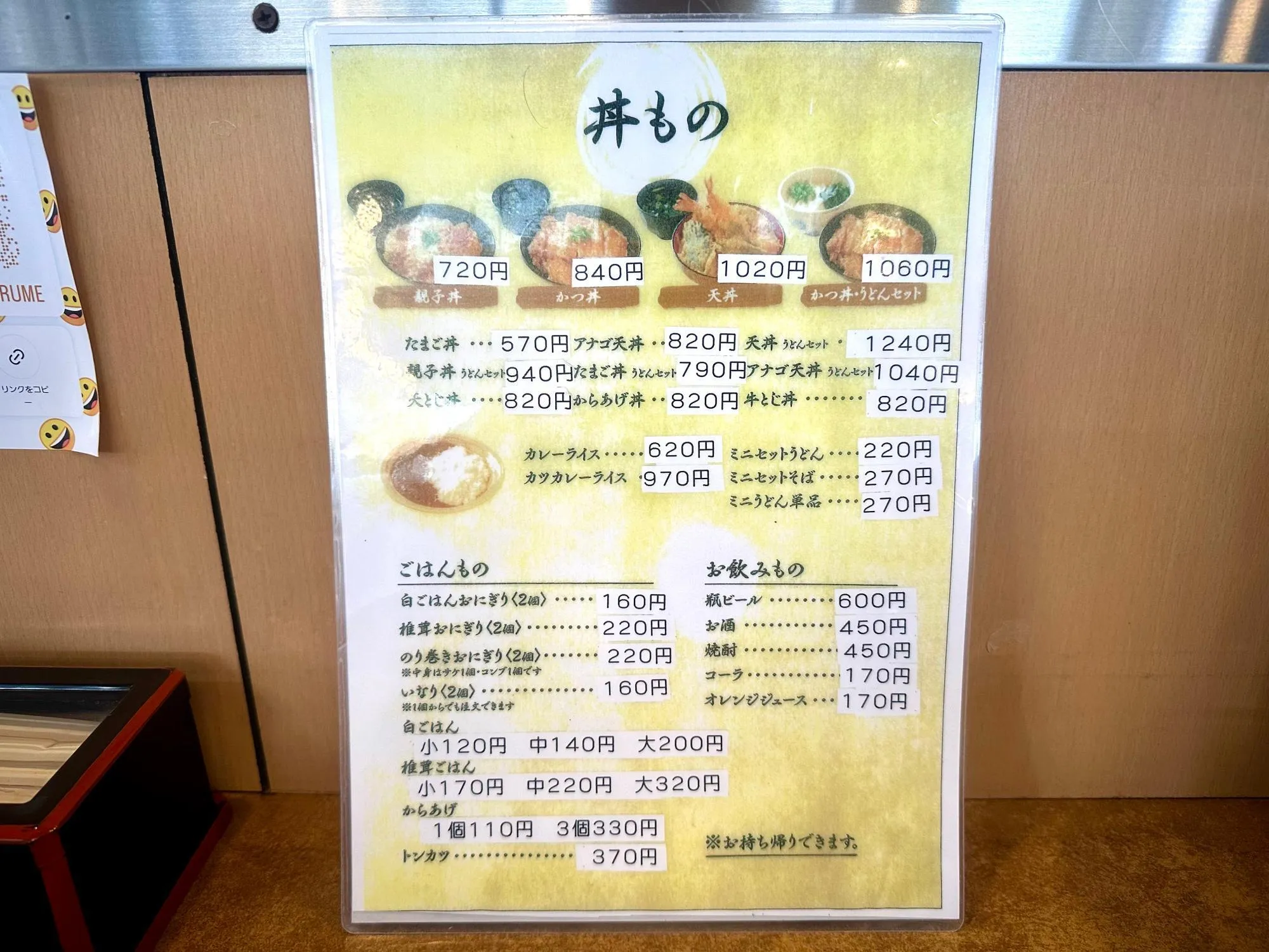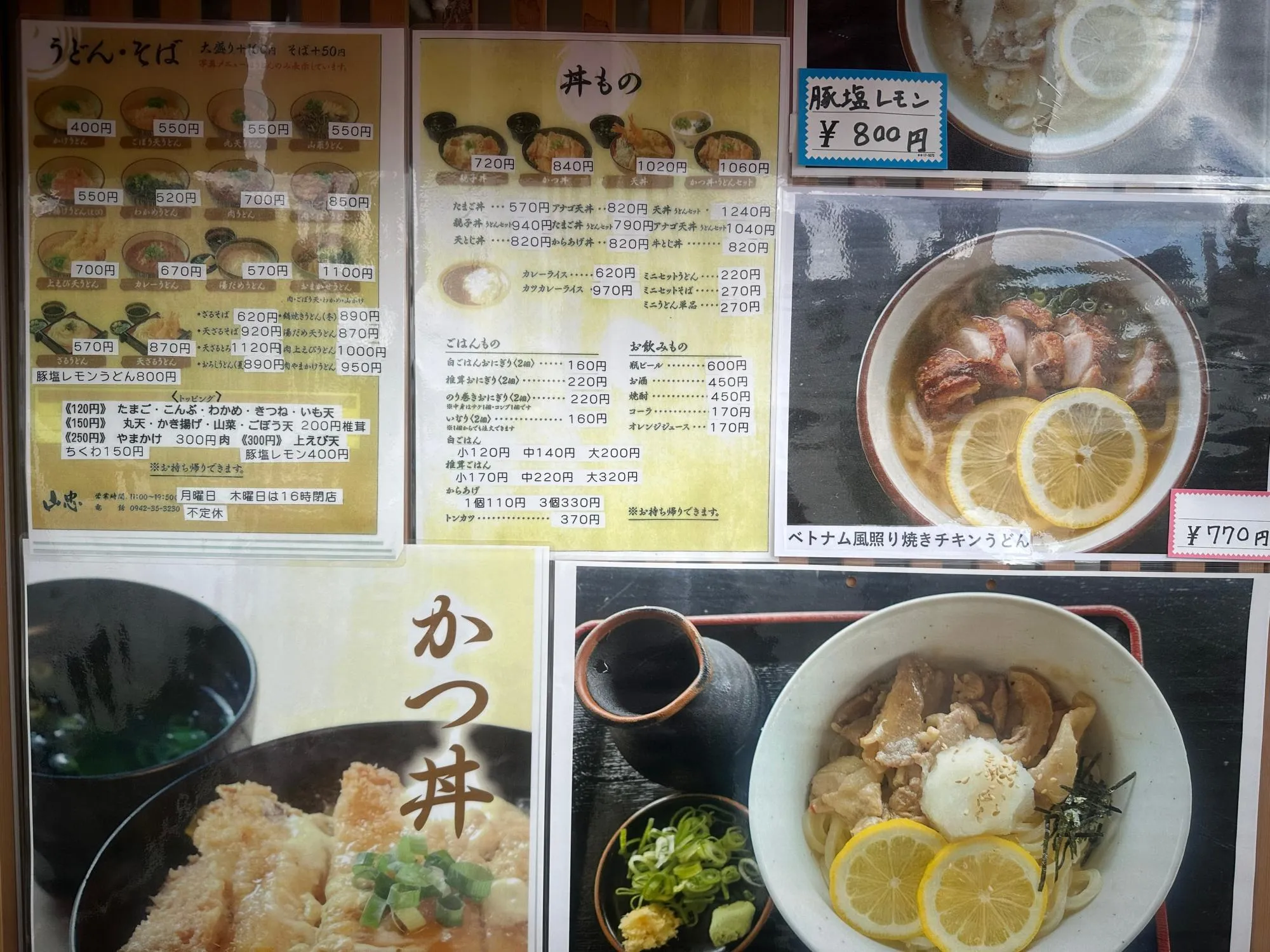 Thực đơn có nhiều loại udon và soba khác nhau, bạn có thể đổi sang soba với giá +50 yên, hoặc đổi sang phần lớn hơn với giá +100 yên.