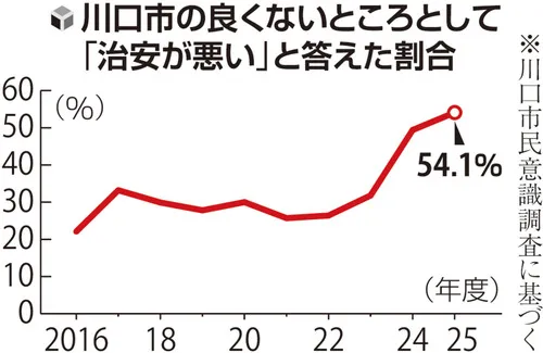 Trong cuộc khảo sát ý thức công dân mà thành phố đang tiếp tục thực hiện, vào năm 2025 (với 1.791 người trả lời), 54,1% đã nêu "tình hình an ninh kém" là "điểm không tốt của thành phố Kawaguchi". Đối với câu hỏi "Bạn có muốn giới thiệu bạn bè hoặc người quen đến sống ở thành phố Kawaguchi không?", tỷ lệ "không muốn giới thiệu" đã đạt 21,5%, lần đầu tiên vượt qua tỷ lệ "muốn giới thiệu".