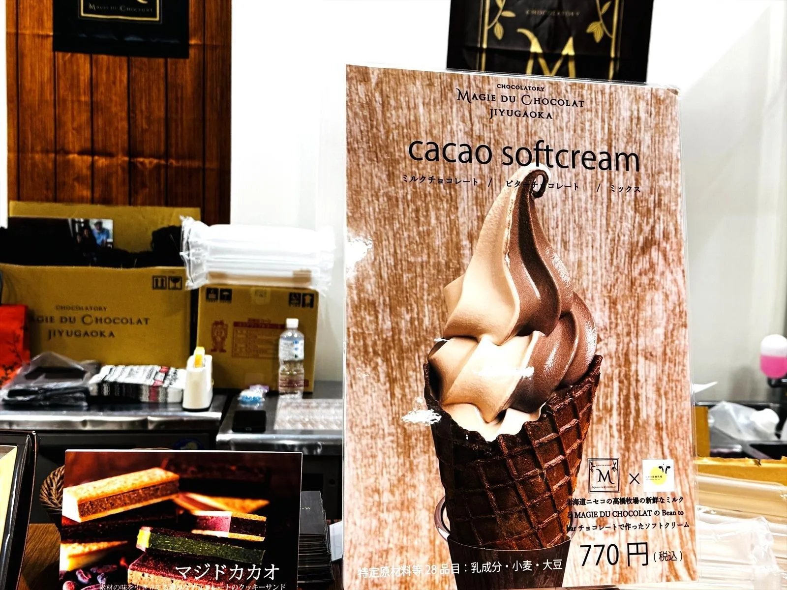 Món kem mềm này sử dụng sữa tươi từ Nông trại Takahashi, Niseko, Hokkaido và sô cô la của "Magie du chocolat".