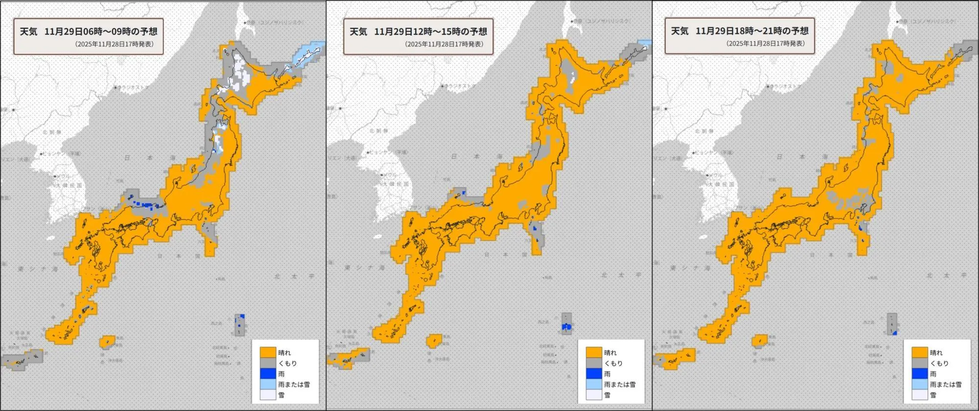 Dự báo phân bố thời tiết sáng (trái), chiều (giữa), và tối (phải) ngày 29 (dựa trên trang web của Cục Khí tượng Nhật Bản).