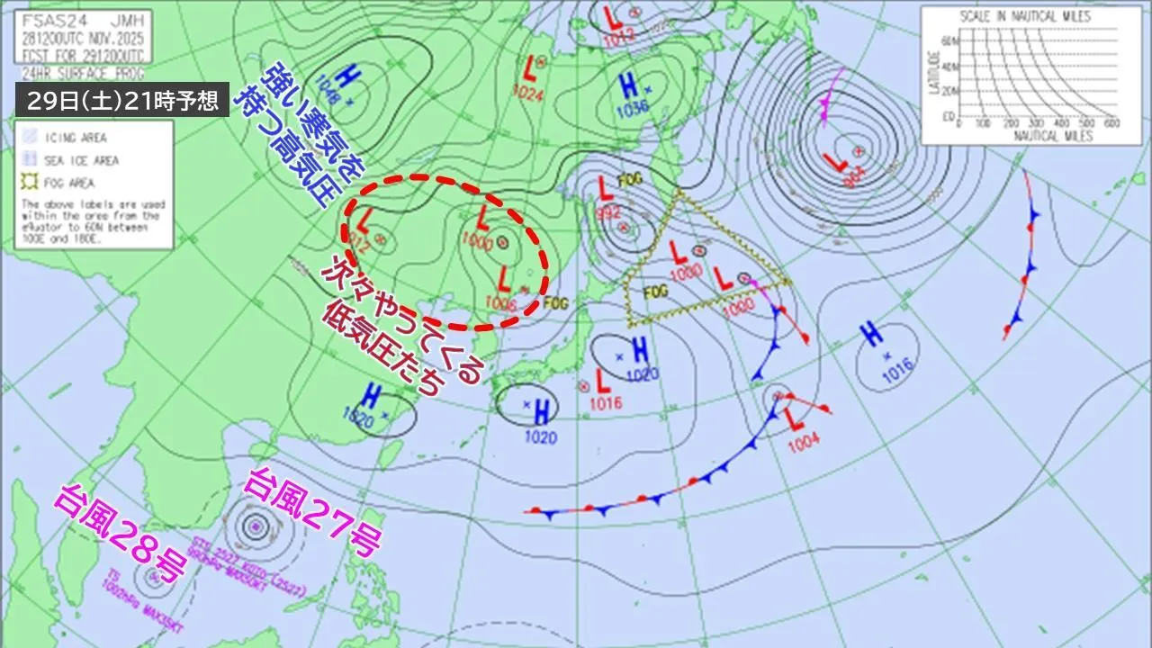 Trên biển phía tây nam xa xôi của Nhật Bản, cơn bão số 28 sắp hình thành, tạo thành tình trạng "kép bão". Tuy nhiên, một khối khí lạnh mạnh nhất mùa này đã chờ sẵn trên lục địa, và có khả năng tuần tới miền Tây Nhật Bản sẽ đón đợt tuyết đầu mùa.