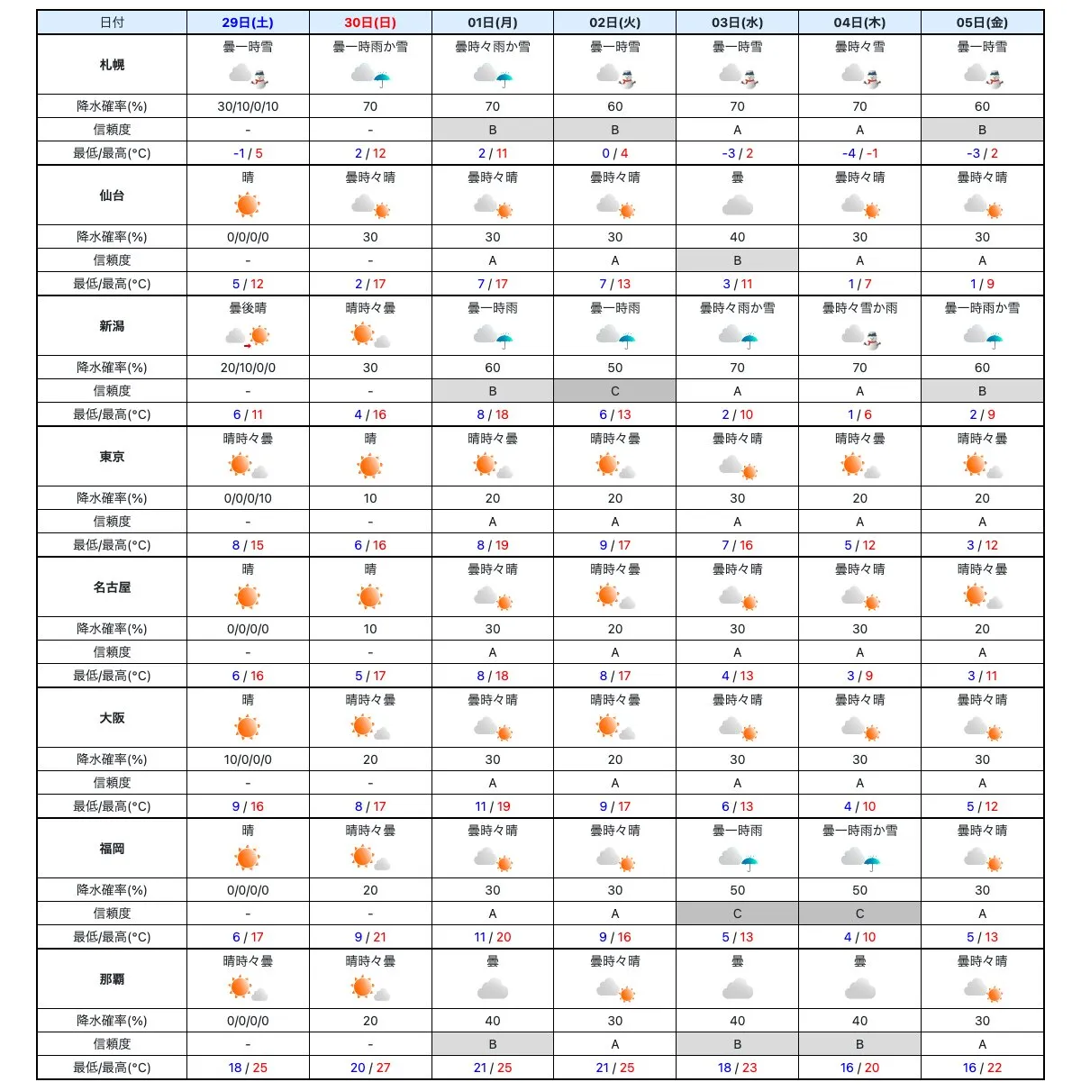 Vào ngày 29, mặc dù có nơi ở miền Bắc Nhật Bản có tuyết rơi vào buổi sáng, nhưng thời tiết sẽ cải thiện trong ngày và đến trưa, gần như toàn quốc sẽ có nắng dịu.