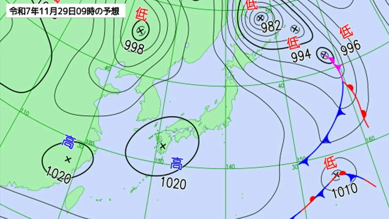 Nhìn về lục địa Trung Quốc phía tây Nhật Bản, sau ngày 30, các vùng áp thấp sẽ liên tiếp đi qua gần miền Bắc Nhật Bản, và sau đó là một áp cao mang theo khối khí lạnh mạnh đang chờ sẵn.
