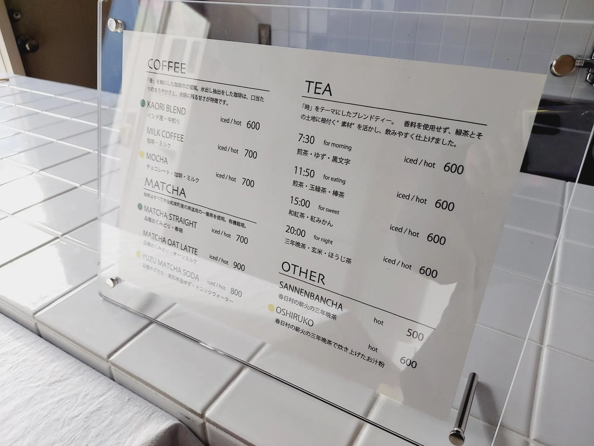 Quán cà phê này chỉ phục vụ mang đi (take-away). Thực đơn đồ uống có tại đây. Ngoài ra, quán cũng bán trà lá và hạt cà phê, vì vậy nếu bạn quan tâm, nên ghé cửa hàng để được tư vấn. Đặc biệt, trong 3 ngày giới hạn từ Thứ Năm, ngày 15 tháng 1 đến Thứ Bảy, ngày 17 tháng 1 năm 2026, khách hàng sẽ được tặng một chén chè đậu đỏ (oshiruko) với trà bancha (số lượng có hạn, chỉ dành cho khách mua hàng).
