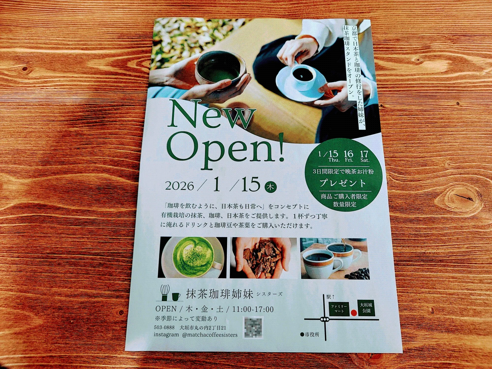 Địa điểm nằm ngay cạnh Công viên Ogaki. Đây là một tòa nhà màu trắng nằm dọc theo Đường tỉnh 237. Quán "Matcha珈琲姉妹 (Matcha Coffee Sisters)" sẽ khai trương như một cửa hàng mới tại tầng 1 của tòa nhà này, ở không gian phía bên trái sau khi bước vào từ cửa. Chúng tôi đã phỏng vấn trước khi quán khai trương.
