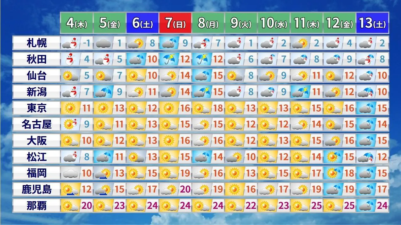 Xem dự báo 10 ngày cho từng khu vực, từ ngày 4 đến ngày 5 tháng 12, nhiệt độ tối đa ở Bắc Nhật Bản, Hokuriku và khu vực ven Biển Nhật Bản của Tây Nhật Bản sẽ ở mức một chữ số, với biểu tượng người tuyết (tuyết) (Hình 4).