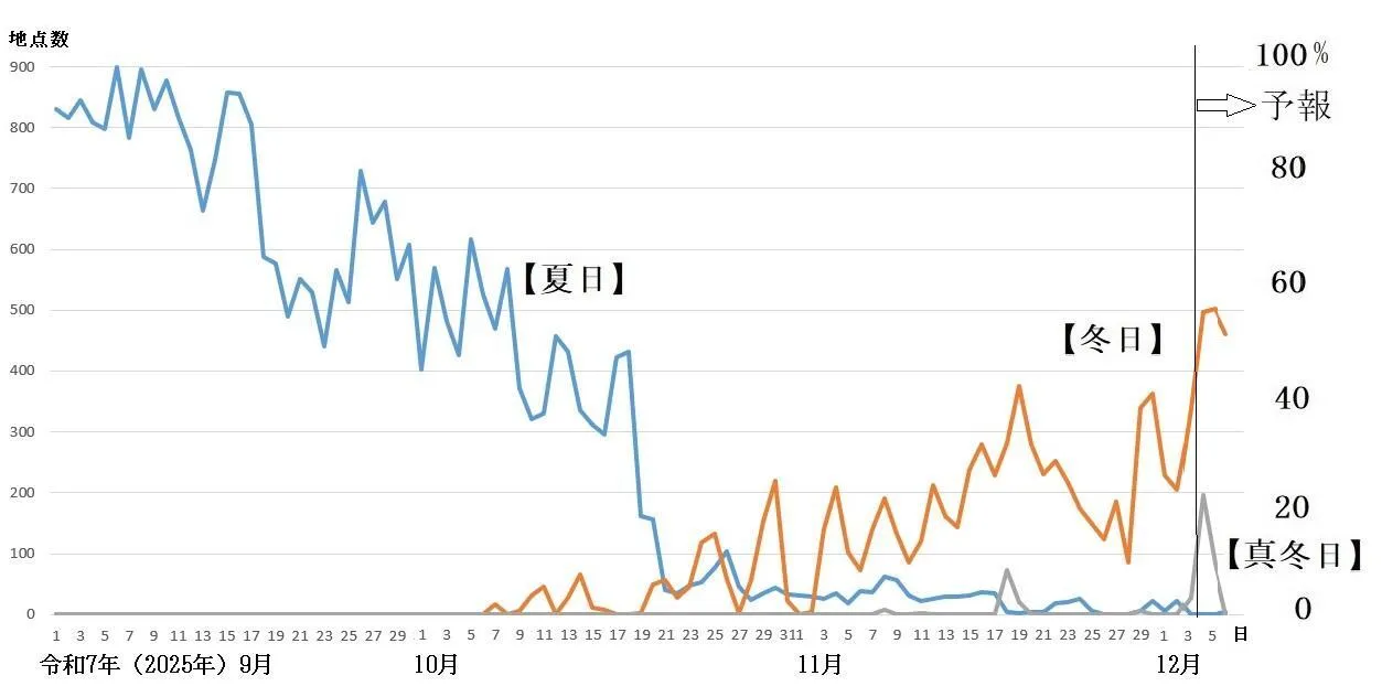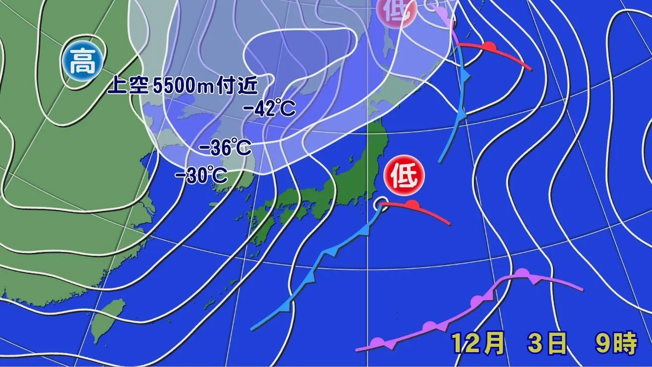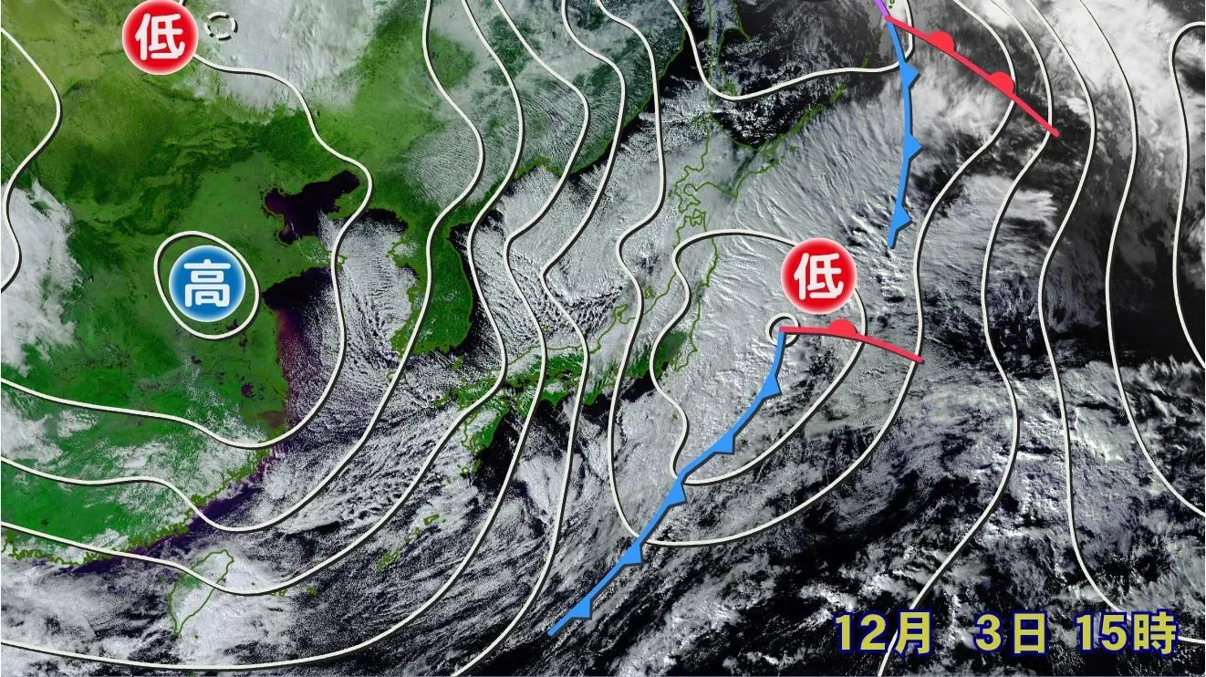 Vào ngày 3 tháng 12 năm Reiwa thứ 7 (2025), một áp thấp đã phát triển và di chuyển về phía bắc từ vùng biển phía nam Kanto đến ngoài khơi Sanriku, khiến hình thế áp thấp mùa đông với áp cao ở phía tây và áp thấp ở phía đông bao trùm từ Tây Nhật Bản (Hình 1).