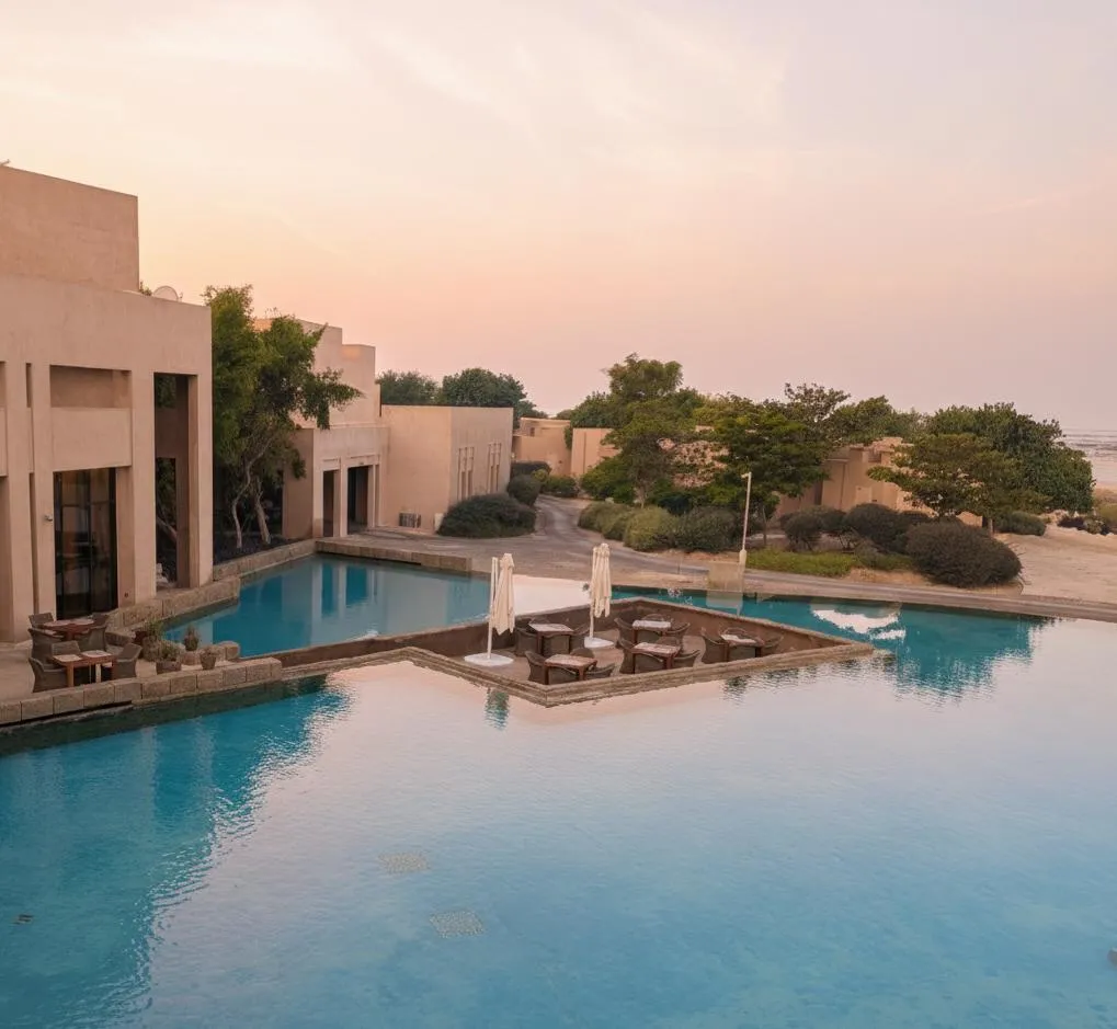 Những đầm phá lớn chứa đầy nước biển rải rác khắp nơi, phản chiếu bầu trời xanh trong vắt. Sau quãng đường dài qua sa mạc, màu xanh tươi của cây cối khiến mắt tôi cay xè. Khắp khuôn viên resort, những chiếc sofa thoải mái và nước khoáng được bố trí khắp nơi, đúng là một thiên đường.
