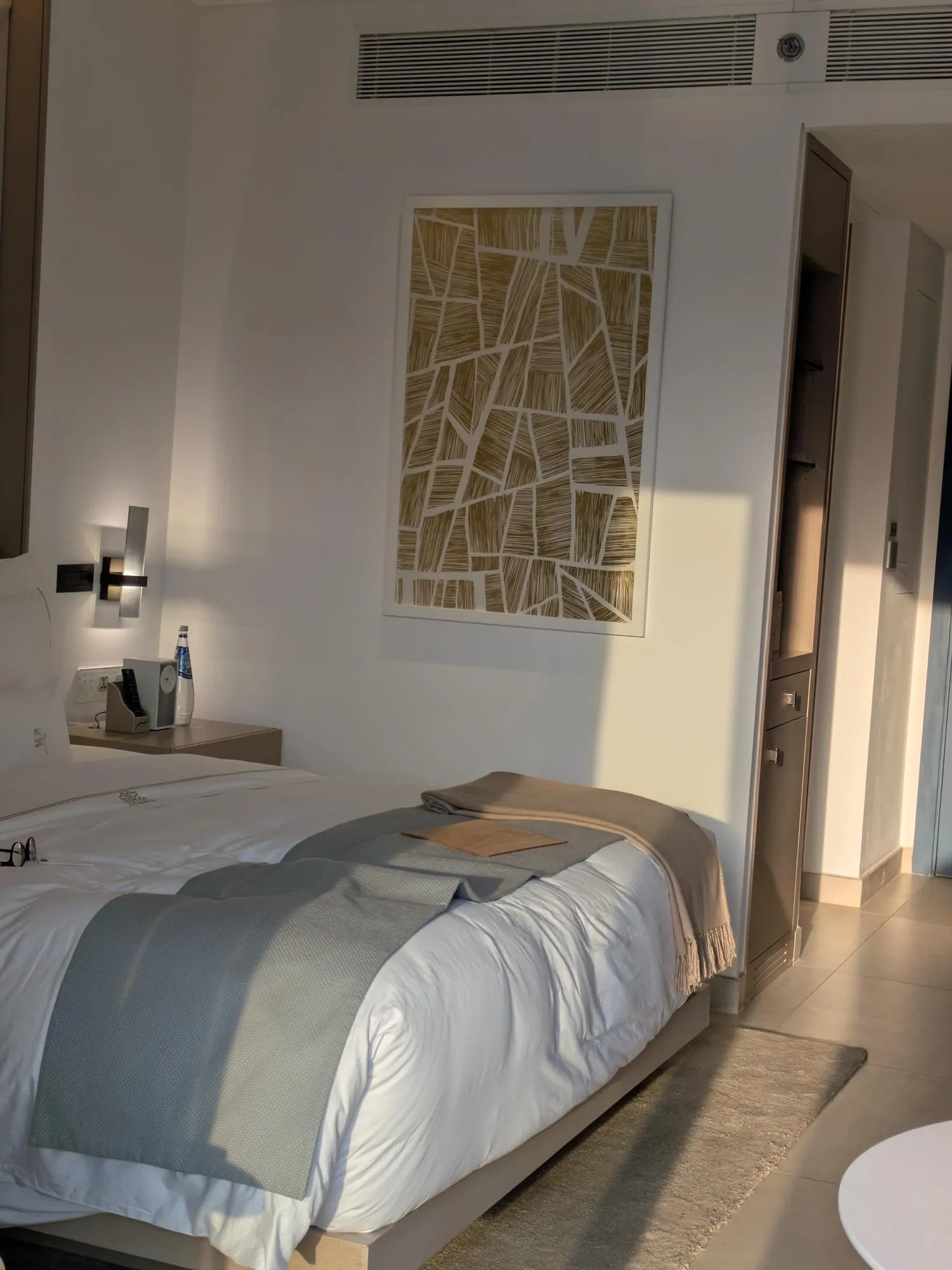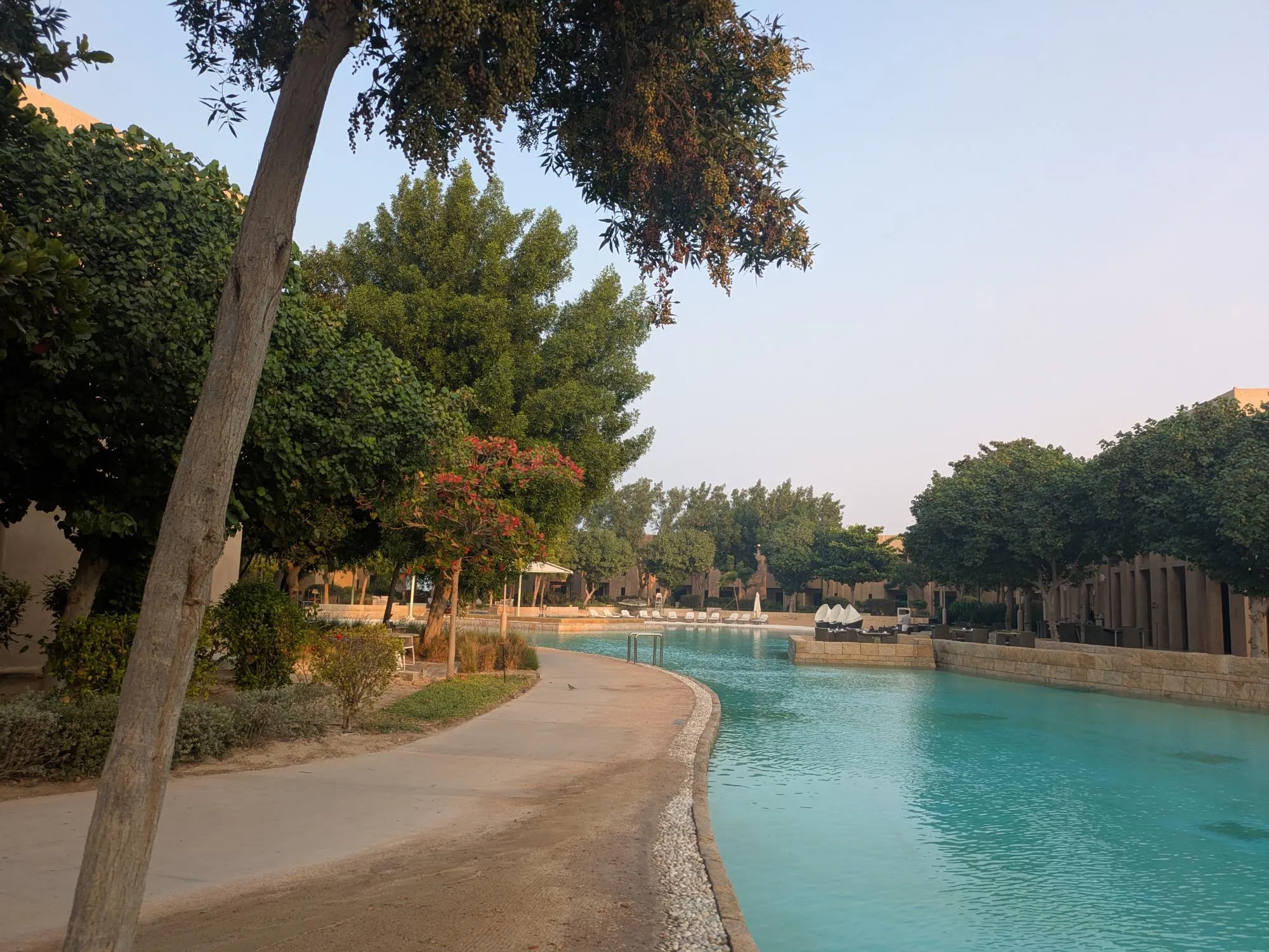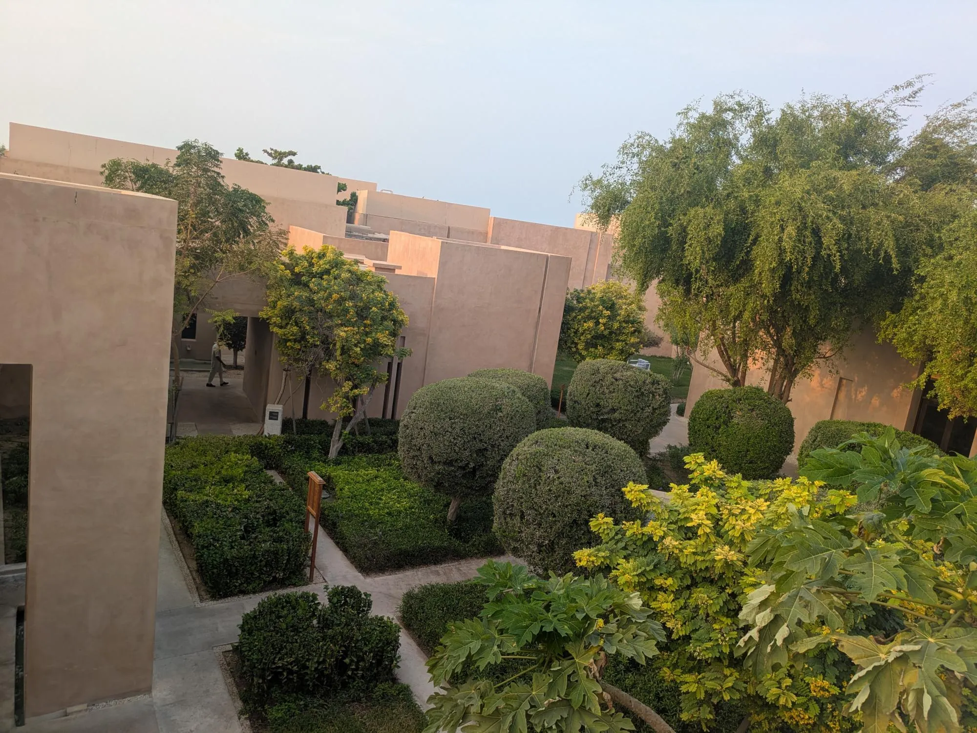 6. Vì khuôn viên rộng lớn, hơn nữa các con đường nhỏ được thiết kế uốn lượn quanh đầm phá lớn, nên từ phòng tôi đến mỗi cơ sở tập thể dục mất khoảng 5 phút đi bộ. Đến nhà hàng hoặc khu vực hoạt động hồ nhân tạo còn mất gần 10 phút. Các tòa nhà mang nét đặc trưng Ả Rập cũng không quen thuộc, khó nắm bắt cấu trúc và quy mô, nên hầu như giống một mê cung. Các đường tắt dường như cố tình không được thiết lập. Mỗi ngày tôi đi lại giữa phòng và các cơ sở nhiều lần, chỉ riêng việc đó cũng là một lượng vận động đáng kể. Đến mức có xe đạp và xe điện được cung cấp để hỗ trợ di chuyển cho người già và trẻ em.