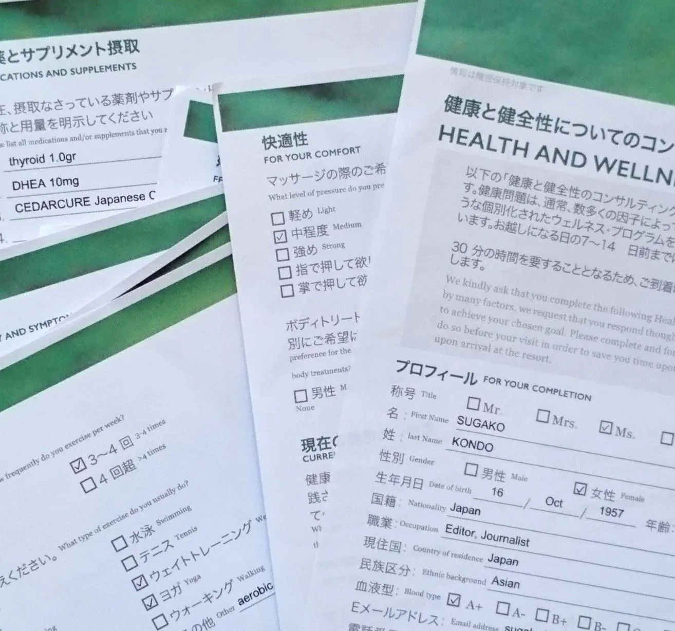 Phiếu khám sức khỏe tư vấn dài 8 trang. Có bản dịch tiếng Nhật, nhưng phải điền tên bệnh mãn tính và thuốc men bằng tiếng Anh. Tôi hơi e ngại khi biết việc giao tiếp tại chỗ cũng chỉ bằng tiếng Anh, nhưng phía bên kia cũng nói tiếng Anh như một ngoại ngữ. Tôi đã có thể giao tiếp mà không gặp vấn đề gì với trình độ tiếng Anh giao tiếp hàng ngày.