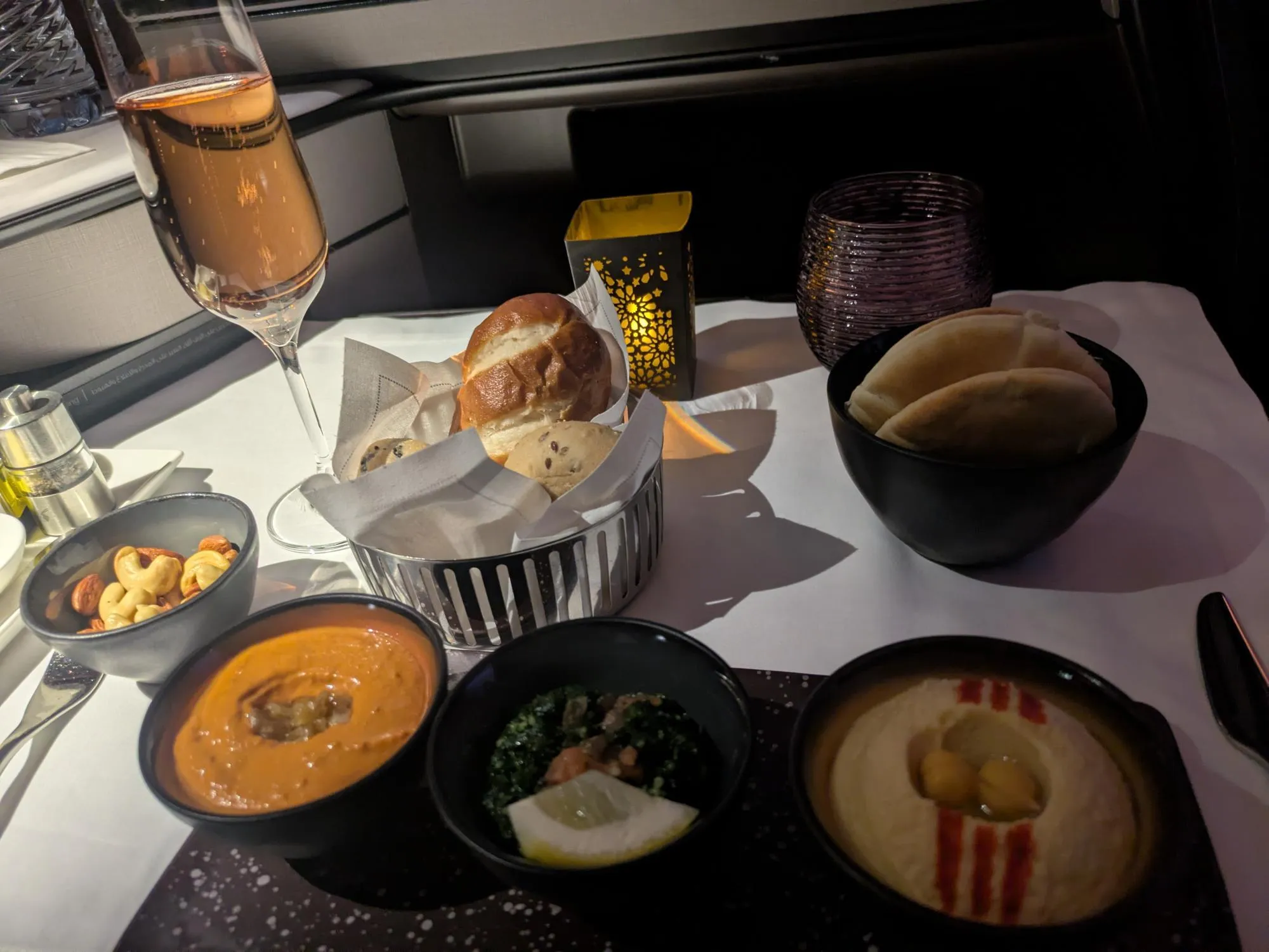 Để chuyến đi phục hồi không bị kiệt sức vì di chuyển, tôi đã mạnh tay chi tiền cho hạng thương gia. Đúng như tin đồn "Sân bay Qatar giờ đây còn đẳng cấp hơn Emirates", tôi được thưởng thức bữa tối sang trọng với nến. Ngon và xa hoa hơn cả một nhà hàng thông thường. Bức ảnh trên chỉ là món khai vị, sau đó là món chính và tráng miệng. Điều làm tôi ngạc nhiên là phụ phí. Nếu bay JAL, tổng chi phí bảo hiểm hàng không là 51.100 yên, nhưng với Qatar Airways chỉ là 4900 yên. Chỉ bằng mức du lịch nội địa phải không? Chắc là vì họ có dầu để bán?