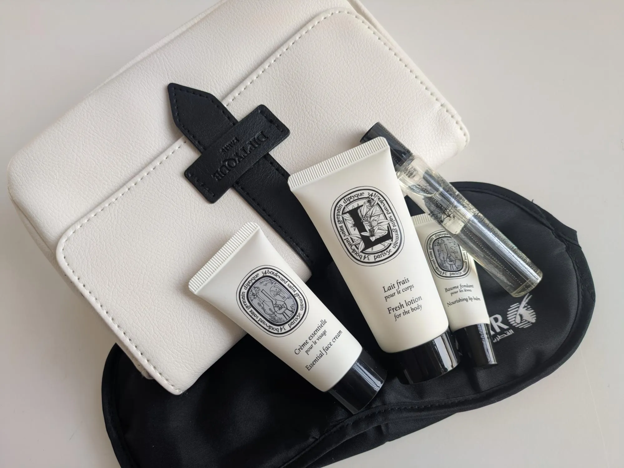 Bộ đồ dùng cá nhân trên Qatar Airways. Thật sành điệu với thương hiệu Diptyque. Trên chuyến bay về, túi đựng có thiết kế khác, rất chu đáo. Ghế ngồi là loại ghế phẳng hoàn toàn, thường thấy ở hạng thương gia, có vách ngăn dạng cửa trượt để tạo không gian riêng tư.
