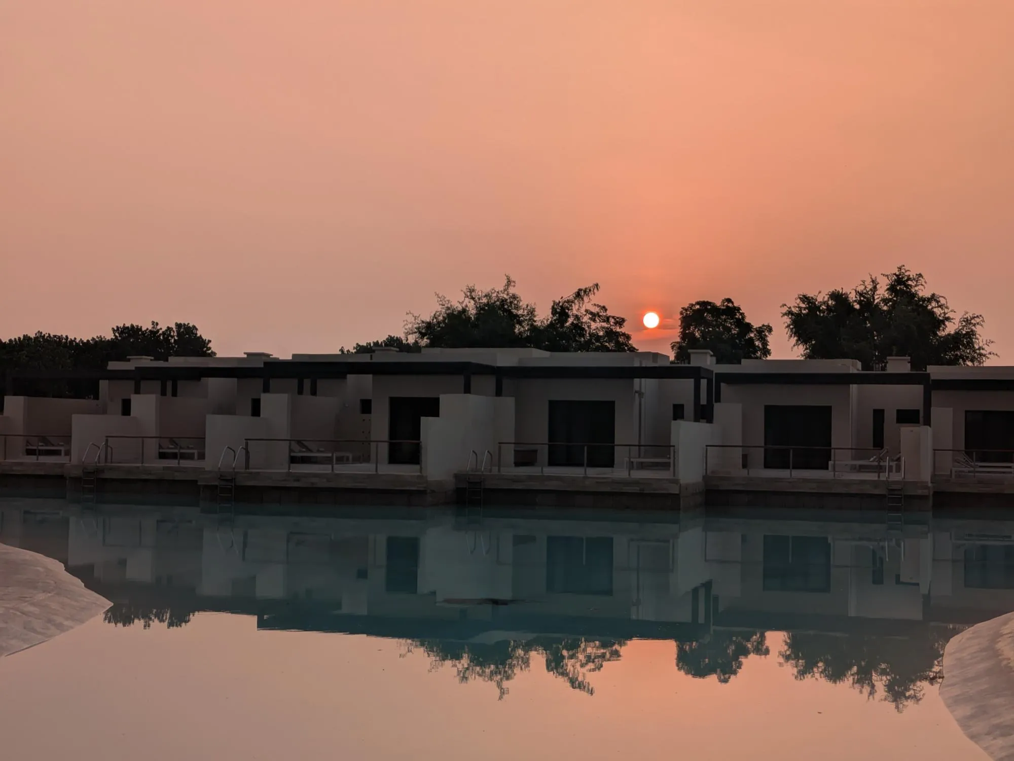 Mỗi sáng, tôi có thể ngắm bình minh huyền ảo từ sân thượng. Các phòng được bố trí đối diện đầm phá nên không có rào cản giữa các phòng. Tuy nhiên, tôi không cảm thấy khó chịu vì hồ rộng và khoảng cách đủ lớn. Đủ xa để không bị chạm mắt khi ở trên sân thượng.