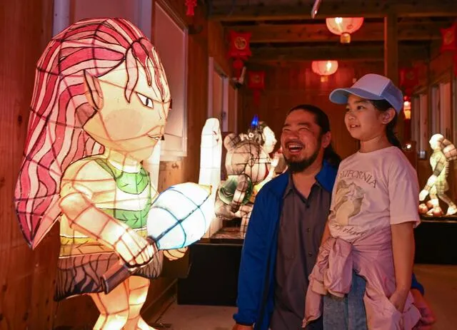 Cha mẹ và con cái đang vui vẻ ngắm đèn lồng yêu quái tại Lễ hội đèn lồng Ryukyu vào tối ngày 1, tại làng trải nghiệm Murasaki Mura ở làng Yomitan (Ảnh: Kise Moriaki)