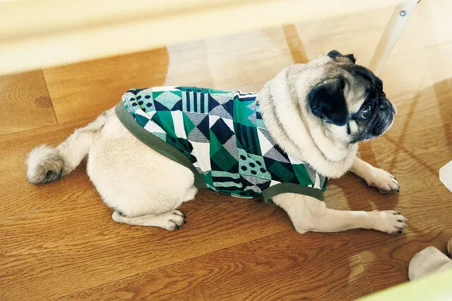 "Chó pug khiến bạn muốn mặc quần áo cho chúng lắm". Gần đây, trang phục yêu thích của MOCHI là chiếc áo ba lỗ họa tiết hình học.