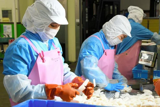 Lao động nước ngoài từ Việt Nam và Trung Quốc đang cân trọng lượng mực đông lạnh = 2:41 chiều ngày 3 tháng 6 năm 2020, thành phố Ofunato, tỉnh Iwate, ảnh của Natsuno Otawara