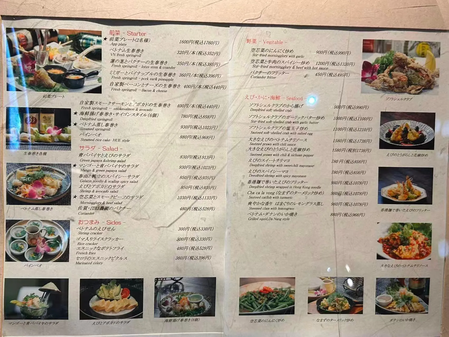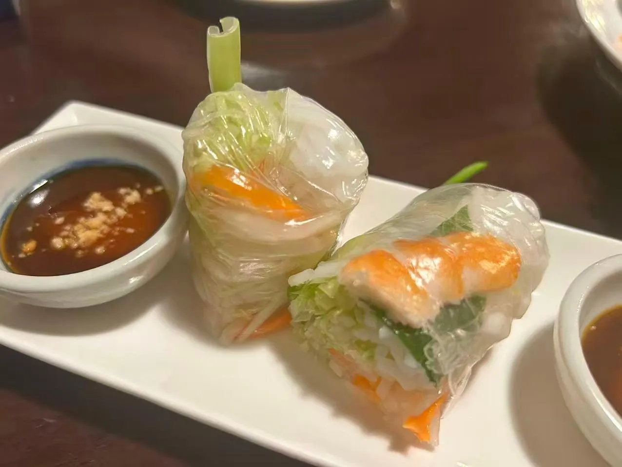 Thực đơn bữa tối đa dạng với các món ăn đặc trưng của Việt Nam, sử dụng nhiều rau xanh. Ngoài gỏi cuốn (nem tươi) truyền thống, nhà hàng còn có nhiều loại chả giò (nem rán) hấp và chiên. Gỏi cuốn Việt Nam là một món ăn lành mạnh với tôm và rau tươi giòn. Chỉ riêng gỏi cuốn đã có vài loại, cho phép bạn thưởng thức nhiều nguyên liệu khác nhau.
