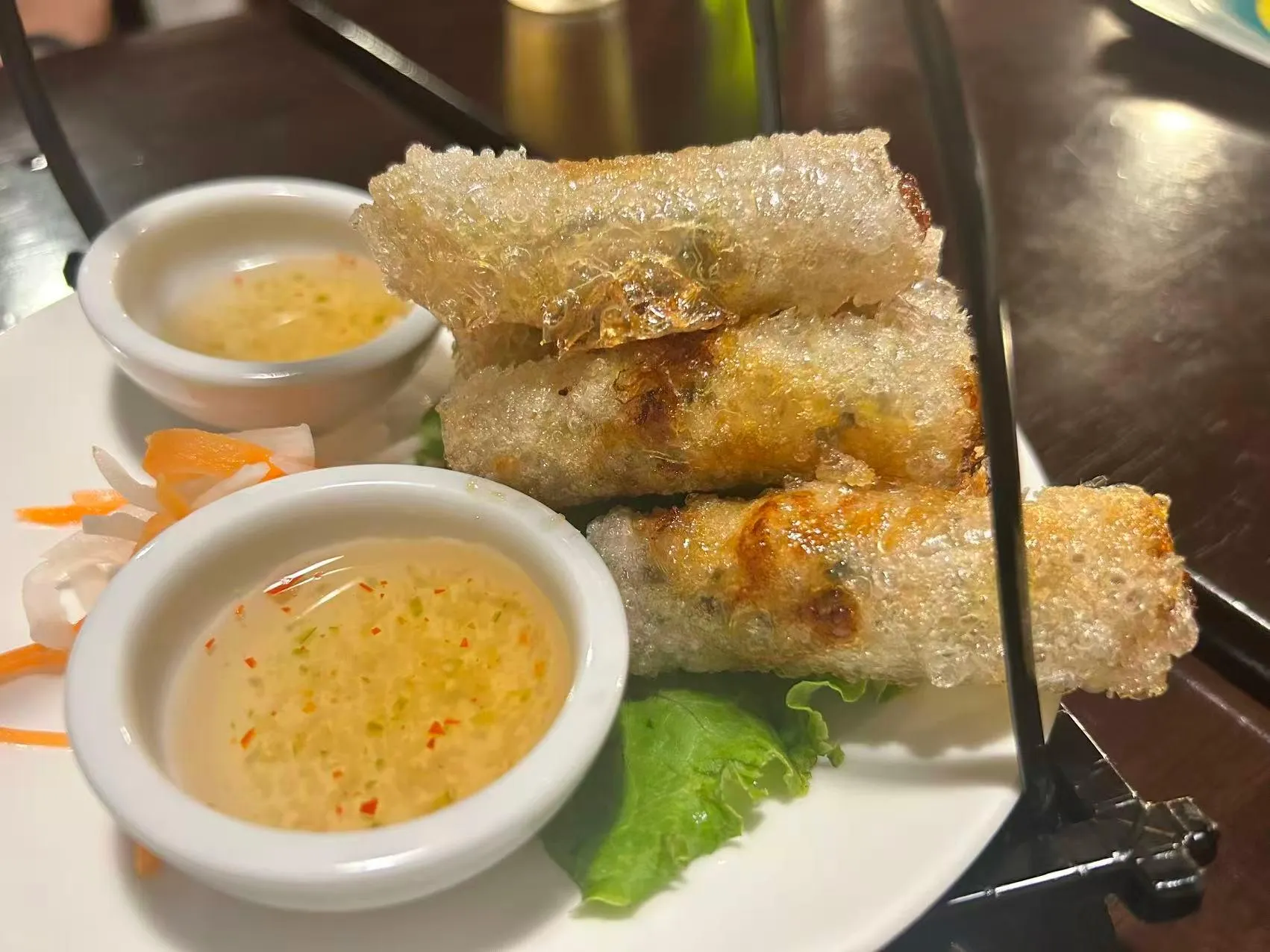 Không thể bỏ qua món chả giò hải sản. Đây là món ăn nhẹ với lớp vỏ giòn tan bên ngoài, bên trong là nhân chả cá hải sản. Thưởng thức cùng nước chấm kiểu dân tộc pha từ nước mắm và giấm. Vị mặn của nhân hải sản rất hợp với bia Đông Nam Á.