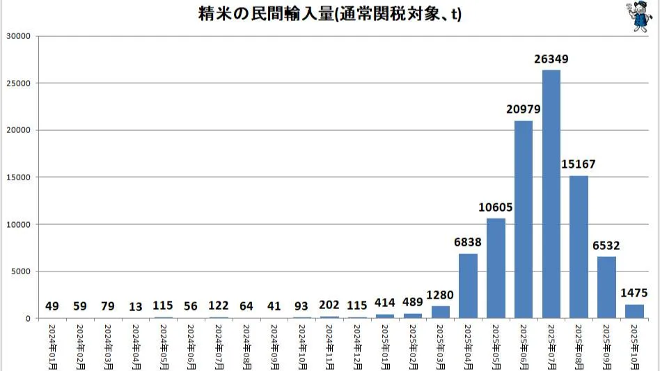 Do giá gạo thị trường tăng cao, lượng gạo nhập khẩu tư nhân (dù phải chịu mức thuế quan cao) đã tăng đáng kể. Theo thống kê thương mại, chỉ riêng tháng 10 năm 2025, lượng nhập khẩu đã đạt 1475 tấn, vượt tổng lượng nhập khẩu trong cả năm 2024 là 1008 tấn.