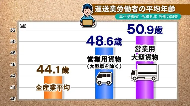 Đây là biểu đồ cho thấy tình trạng già hóa trong ngành logistics. Trong khi độ tuổi trung bình của toàn ngành là 44,1 tuổi, tài xế xe tải là 48,6 tuổi. Riêng đối với xe tải lớn, con số này vượt quá 50 tuổi, cho thấy tình trạng già hóa và thiếu hụt lao động đang nghiêm trọng. Trước tình hình này, chính phủ dự kiến tiếp nhận 24.500 tài xế nước ngoài vào cuối năm tài chính 2028. Các tài xế nước ngoài được chính phủ kỳ vọng sẽ trở thành cứu tinh cho ngành logistics Nhật Bản, vốn đang đối mặt với tình trạng thiếu hụt nhân lực trầm trọng. Ngay cả trong tỉnh, các nỗ lực nhằm tiếp nhận họ cũng đã bắt đầu.