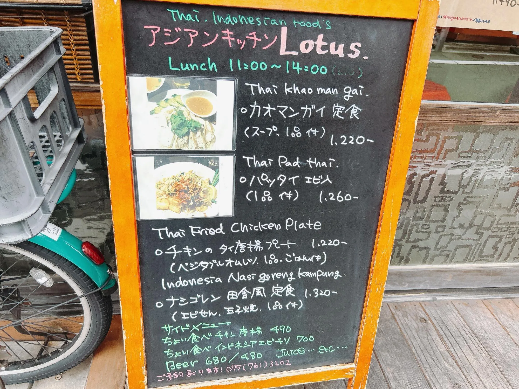 Cách ga Sanjo Keihan của Tuyến tàu điện ngầm Tozai, Kyoto khoảng 6 phút đi bộ là "Asian Kitchen Lotus", nằm yên bình trên đường Niomon. Đây là một cửa hàng được cải tạo từ một machiya (nhà phố truyền thống Kyoto) cũ, với lá cọ và bảng đen menu viết tay, tạo không khí như một quán ăn đường phố Đông Nam Á.