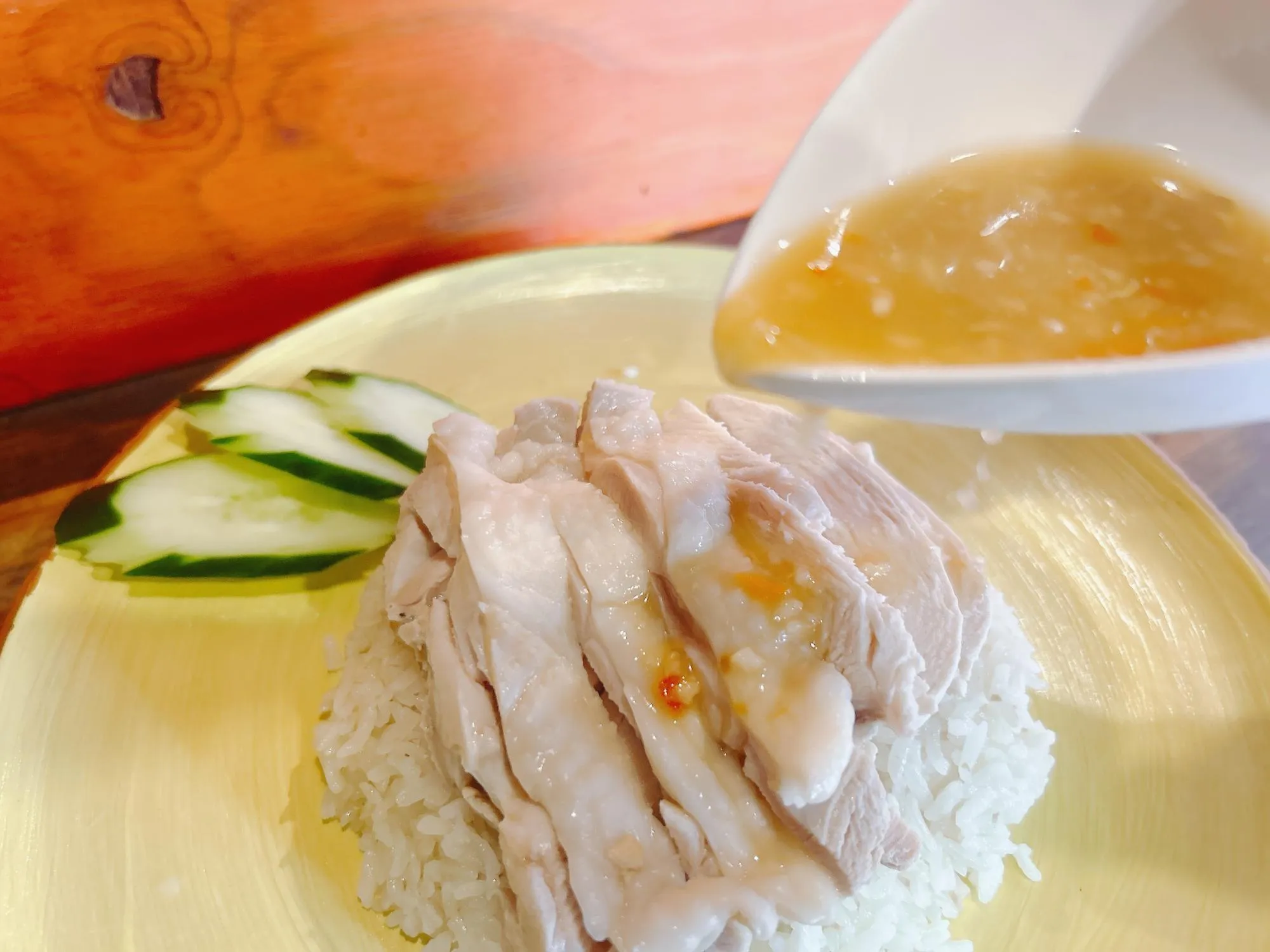 "Khao Man Gai Teishoku" 1.220 yên (đã bao gồm thuế) Lần này, tôi đã gọi món Khao Man Gai Teishoku, một món ăn Thái phổ biến. Cơm nhài được nấu với nước dùng gà, bên trên là nhiều thịt gà hấp mềm mọng.