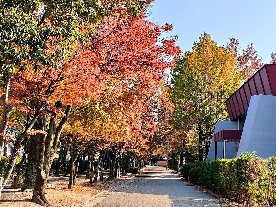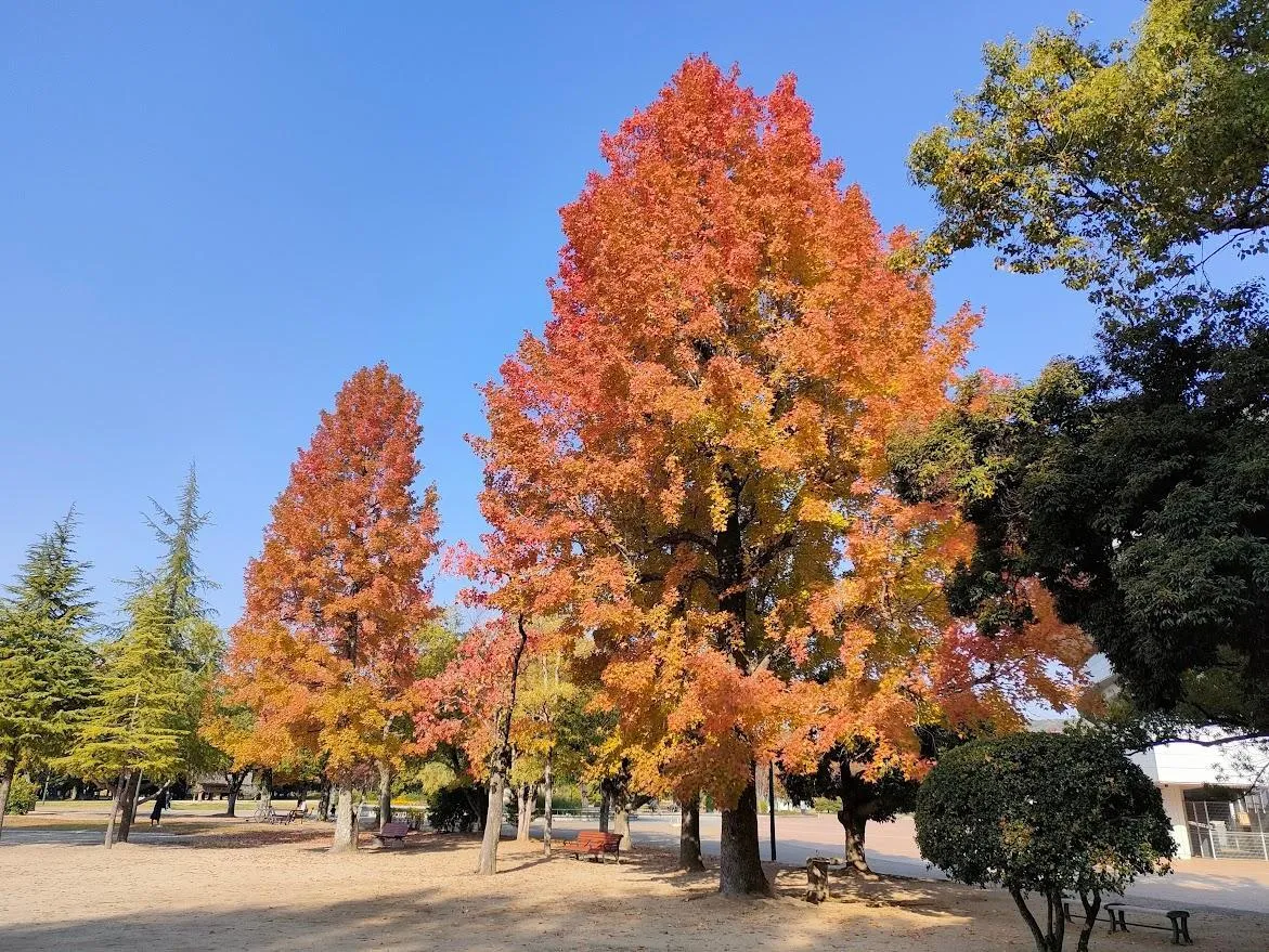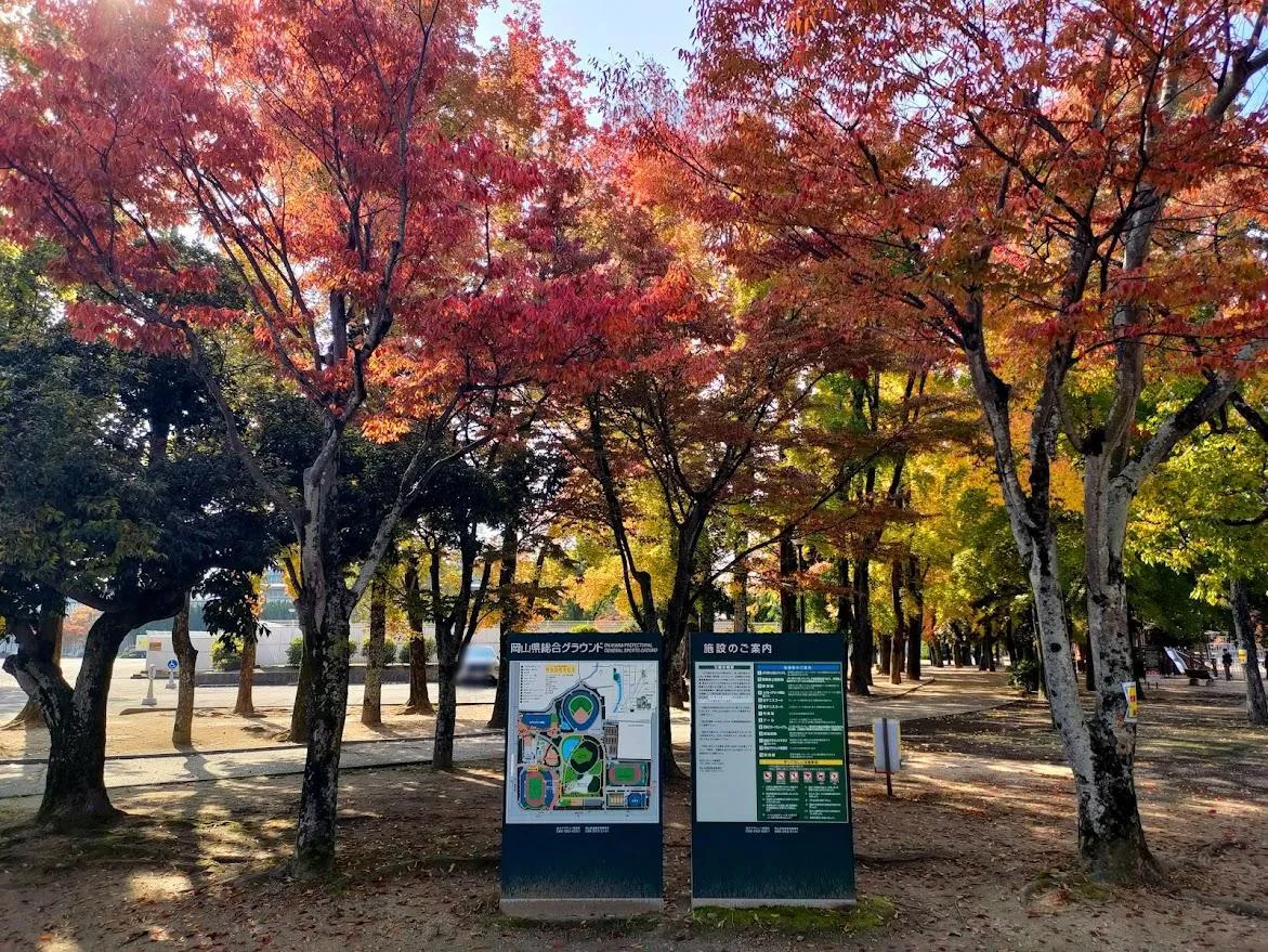 Tại "Công viên Tổng hợp Okayama" ở khu vực Kita, thành phố Okayama, cây cối trong công viên đã chuyển sang màu đỏ và vàng rực rỡ, tạo nên khung cảnh mùa thu tuyệt đẹp. Trên khuôn viên rộng lớn này có nhiều điểm ngắm lá đỏ khi tản bộ, bạn có thể thong thả tận hưởng cảnh quan đầy màu sắc theo mùa. Có nhiều điểm chụp ảnh đẹp, rất lý tưởng cho chuyến đi chơi mùa thu. (Ngày chụp: 14 tháng 11 năm 2025)