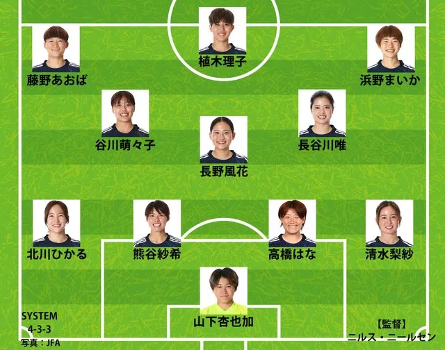 Dự kiến đội hình ra sân là 4-3-3. Thủ môn Yamashita Ayaka, 4 hậu vệ từ trái sang là Kitagawa Hikaru, Kumagai, Takahashi Hana, Shimizu Risa. Tiền vệ phòng ngự là Nagano Fuuka, tiền vệ trung tâm là Hasegawa (trái) và Tanigawa Momoko (phải). Ba tiền đạo là Fujino Aoba (trái), Ueki Riko (trung tâm), Hamano Maika (phải).
