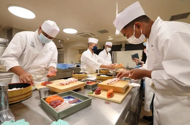 *Người có tư cách "Kỹ năng đặc biệt" đến từ Philippines đang được đào tạo làm sushi. Tập đoàn "Ginza Onodera", chuyên kinh doanh các nhà hàng sushi cao cấp, đã tổ chức các khóa đào tạo riêng cho những người có tư cách "Kỹ năng đặc biệt" tại các cơ sở liên quan để đào tạo nhân tài (chụp tháng 11 năm 2022) (Jiji)