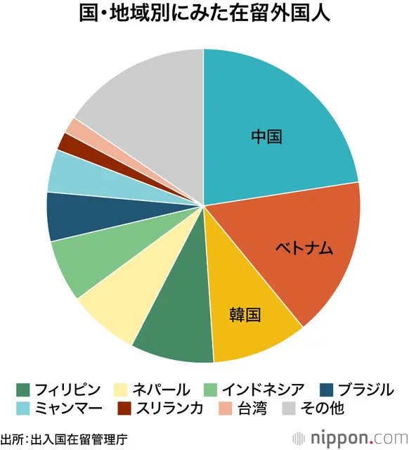 Theo quốc tịch/khu vực, Trung Quốc đứng đầu với 934.028 người (tăng 6,5% so với năm trước), tiếp theo là Việt Nam với 681.100 người và Hàn Quốc với 407.341 người. Theo loại tư cách lưu trú, cả 5 loại tư cách hàng đầu đều tăng, trong đó "Người vĩnh trú" chiếm nhiều nhất với 947.125 người (tăng 3,2% so với cùng kỳ năm trước). Đặc biệt, "Kỹ năng đặc biệt", được coi là "người nhập cư thực tế", đã tăng mạnh 37,2% lên 392.096 người, là mức tăng lớn nhất trong số 5 loại tư cách.