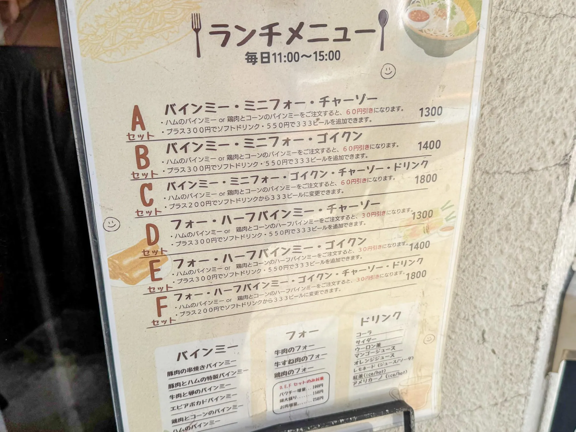 Đây là thực đơn bữa trưa. Có các suất ăn kết hợp cả bánh mì và phở.