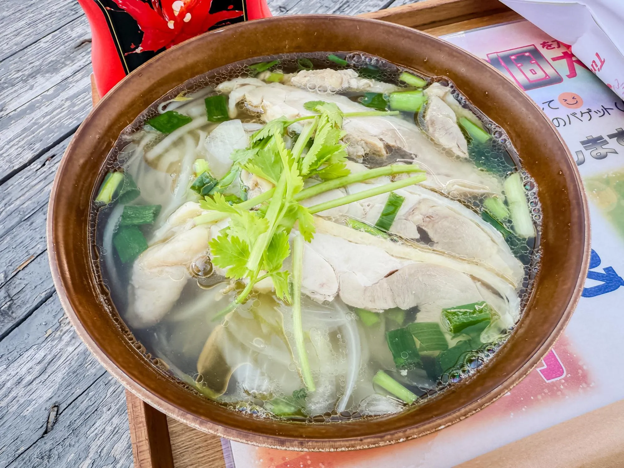 Phở gà là một món mì của Việt Nam. Sợi mì và nước dùng rất hợp khẩu vị của tôi, một người thích udon. Phần bình thường đã khá no, nên nếu gọi phần lớn (700 yên) chắc chắn sẽ no căng bụng. Lượng rau mùi trong món này cũng rất vừa phải.