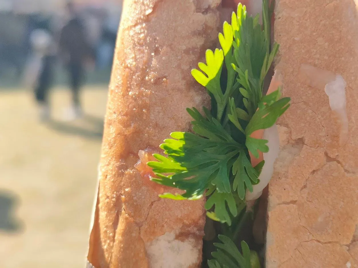 Bên trong chiếc bánh mì baguette giòn tan là hai loại giò Việt Nam, thịt heo khô Việt Nam, pate gan heo, dưa góp, sốt trứng, dưa chuột, rau mùi và tương ớt. Rất đầy đặn và ngon miệng. Rau mùi cũng không gây khó chịu chút nào. Đối với tôi, lượng rau mùi vừa đủ để ngon. Ai thích rau mùi có thể thêm nhiều hơn, còn ai không thích vẫn có thể thưởng thức mà không cần rau mùi.