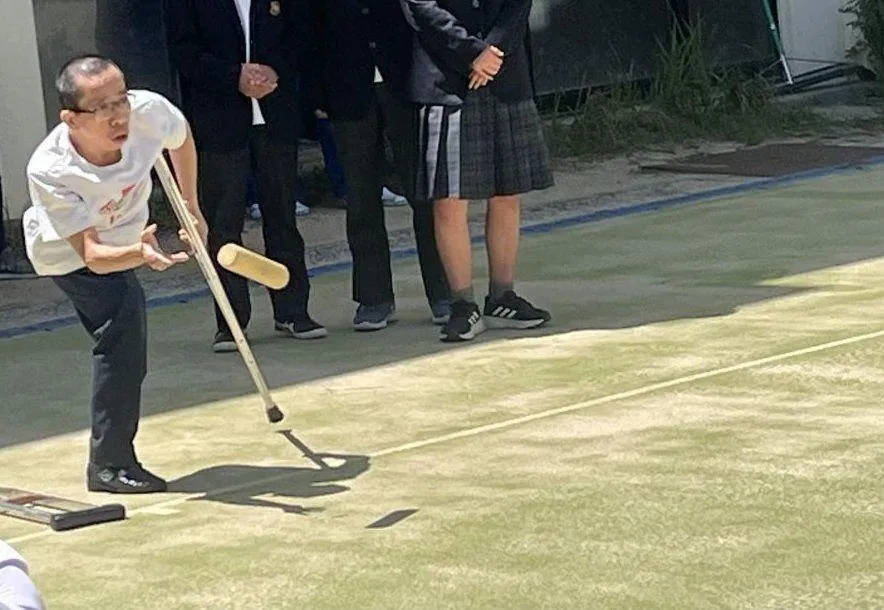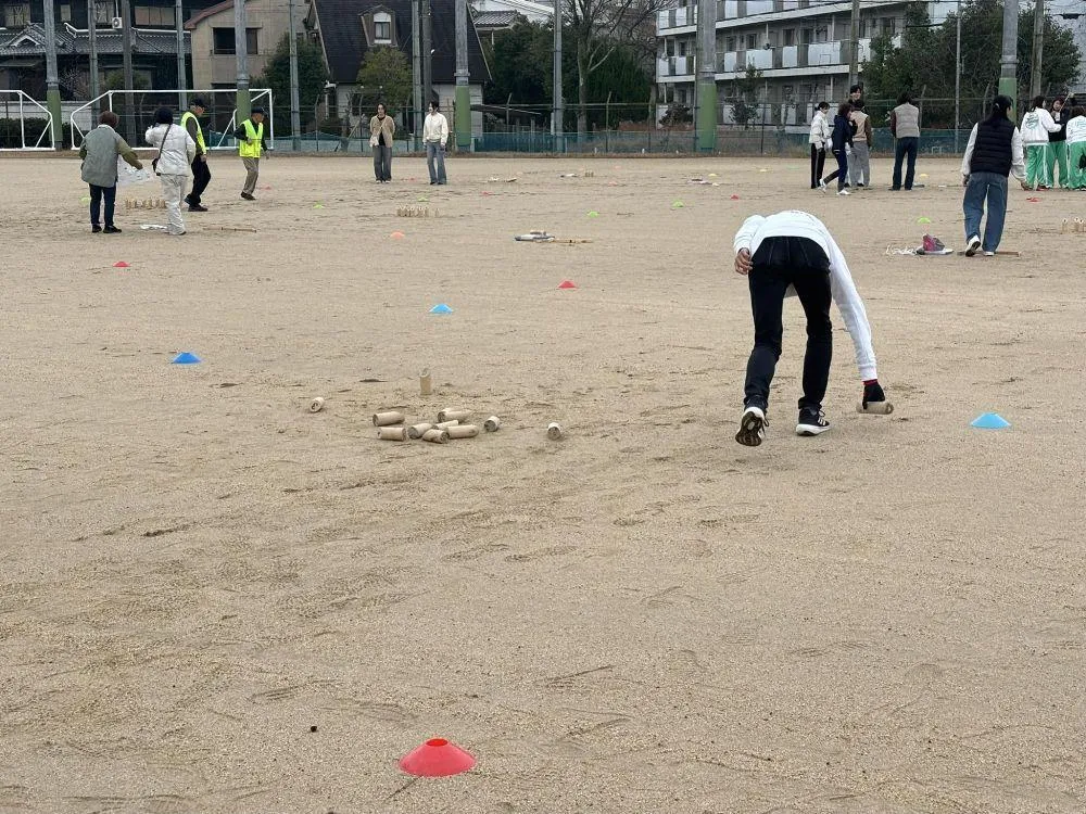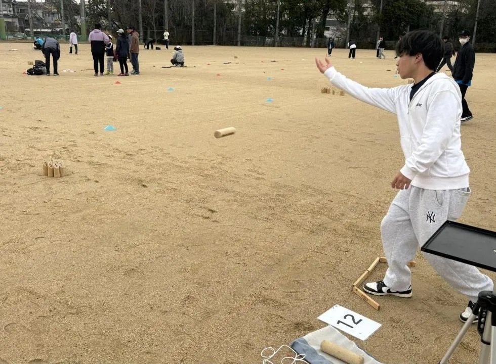 Năm 2023, anh Nguyễn Đức (từ Việt Nam) cùng các học sinh trường Trung học Higashi vui chơi Molkky.