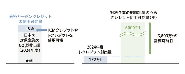 Tối đa 10% lượng phát thải thực tế có thể được bù đắp bằng J-Credit, là chứng nhận giảm và hấp thụ trong nước, và JCM Credit, được tạo ra từ các dự án giảm phát thải CO2 ở nước ngoài. Nguồn: eRex "Tài liệu tham khảo báo chí 2026"