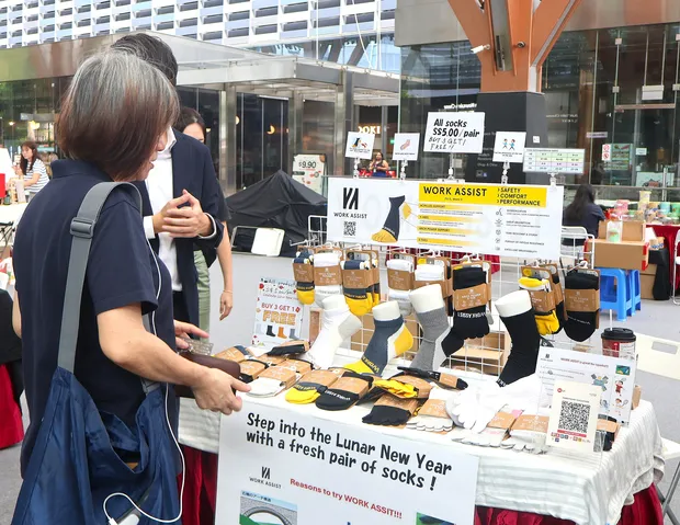 Yamatsune đã mở cửa hàng pop-up để quảng bá cho thương hiệu tất chức năng "Work Assist" giúp giảm mỏi chân của công ty = ngày 30 tháng 1, trung tâm Singapore (ảnh NNA)
