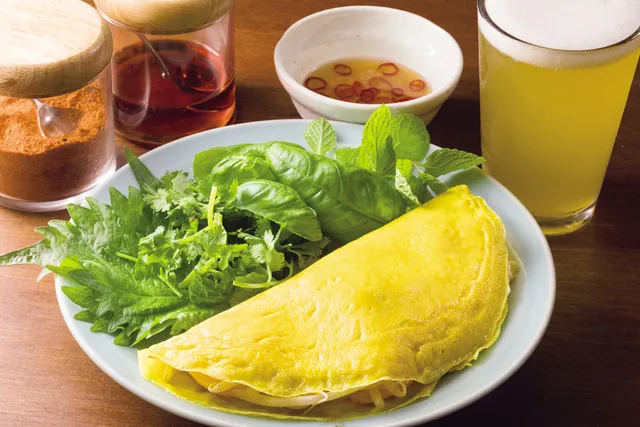 Bánh Xèo tại 'Noodle House Laundry'. Giá 630 yên. Lớp bột màu vàng nghệ giòn rụm bên ngoài, mềm dai bên trong.