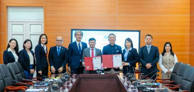 Chủ tịch Tổ chức Du lịch Nachikatsuura, ông Matsushita Tetsuya (giữa bên phải) và Hiệu trưởng Đại học Hạ Long, ông Nguyễn Đức Thiếp (giữa bên trái) cầm biên bản ghi nhớ