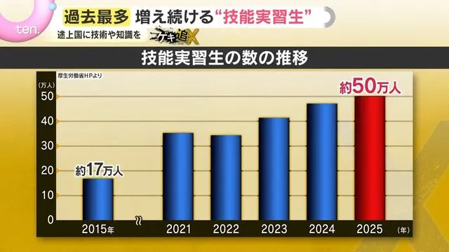 Chương trình thực tập sinh kỹ năng là một chương trình do Nhật Bản, một quốc gia phát triển, tạo ra để truyền đạt kỹ thuật và kiến thức cho các nước đang phát triển. Người nước ngoài đến Nhật Bản với tư cách là "thực tập sinh" thông qua các tổ chức giám sát trung gian và học hỏi kỹ thuật trong khi làm việc tại các công ty trong một khoảng thời gian nhất định. Theo Bộ Y tế, Lao động và Phúc lợi, số lượng thực tập sinh kỹ năng đang tăng lên hàng năm và đạt khoảng 500.000 người vào năm 2025.